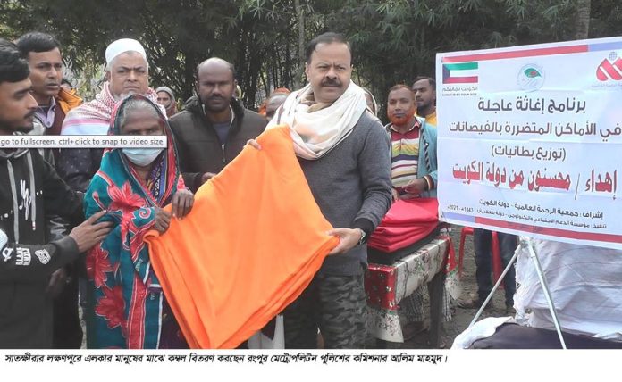 সাতক্ষীরা প্রতিনিধি : সাতক্ষীরার তালায় শীতার্ত ৪’শ মানুষের মাঝে কম্বল,এতিমখানার শিশুদের মাঝে পোশাক বিতরণ ও অসহায় মানুষকে বিনামুল্যে চিকিৎসা সেবা ও ওষুধ বিতরণ করা হয়েছে। রংপুর মেট্রোপলিটন পুলিশের ডিআইজি আলিম মাহমুদ। শুক্রবার সকালে তার নিজ গ্রাম তালার লক্ষণপুরে এসকল সামগ্রী বিতরণ করেন এবং বিশেষজ্ঞ চিকিৎসকগণ চিকিৎসা সেবা দেন। এসময় তালা থানার ওসি আবু জেহাদ ফকরুল আলম খান,পাটকেলঘাটা থানার ওসি কাঞ্চন কুমার রায়,তেতুলিয়া ইউপি চেয়ারম্যান আবুল কালাম আযাদ,ব্যবসায়ী আমিনুর রহমান আমিন,শেখ মাহমুদুল ইসলামসহ এলাকার গণ্যমান্য ব্যক্তিবর্গ উপস্থিত ছিলেন। আলিম মাহমুদ এসময় বলেন, এলাকায় সামাজিক দায়বদ্ধতার অংশ হিসেবে অসহায় মানুষের পাশে দাড়িয়েছি। পিতা আনছার মাহমুদের নামে প্রতিষ্ঠিত আনছার মাহমুদ এতিমখানা ও লিল্লাহ বোর্ডিংয়ে যেসব শিশু-কিশোররা রয়েছে,ইসলামী শিক্ষার পাশাপাশি আধুনিক শিক্ষায় শিক্ষিত করে তাদের মাধ্যমে অসাম্প্রদায়িক চেতনার বাংলাদেশ গড়ে তুলবার প্রয়াস অব্যাহত থাকবে বলে জানান তিনি। তিনি এ সময় ৪শ’ জন শীতার্ত মানুষের মাঝে কম্বল বিতরণ করেছেন। এছাড়া এতিমখানার ১শ’ ৫০ জন শিশু-কিশোােরর মাঝে পোশাক বিতরণ করেছেন তিনি। পাশাপাশি এলাকার অসহায় ৫শ’ ব্যক্তিকে বিশেষজ্ঞ চিকিৎসক দ্বারা বিনামুল্যে চিকিৎসা সেবা ও ওষুধ বিতরণ করা হয়েছে। এছাড়া লক্ষণপুর সরকারি প্রাথমিক বিদ্যালয়ের সকল শিক্ষার্থীকে পোশাক ও শিক্ষা উপকরণ বিতরণ করেছেন পুলিশ কর্মকর্তা আলিম মাহমুদ। সম্প্রতি এলাকায় বিশুদ্ধ পানি সরবরাহের জন্য ১৫টি টিউবওয়েলও বসিয়ে দিয়েছেন তিনি। প্রসঙ্গত,আলিম মাহমুদ তার পিতা সরকারি প্রাথমিক বিদ্যালয়ে সাবেক শিক্ষক মরহুম আনছার মাহমুদের স্মরণে তালা উপজেলার লক্ষণপুর গ্রামে ‘আনছার মাহমুদ স্মৃতি সংস্থা’ গড়ে তুলেছেন। প্রতিষ্ঠা করেছেন ৫ তলা ভবন বিশিষ্ট ‘আনছার মাহমুদ এতিমখানা ও লিল্লাহ বোর্ডিং’। প্রচলিত ধারার বাইরে এসে এতিম শিশুদের ধর্মীয় শিক্ষার পাশাপাশি কারিগরী প্রশিক্ষণ দেওয়া হচ্ছে। ইংরেজিসহ সাধারণ শিক্ষাও দেওয়া হচ্ছে তাদের।