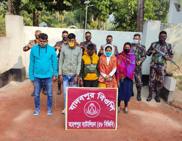 মহেশপুর(ঝিনাইদহ) অফিস : ঝিনাইদহের মহেশপুর সীমান্ত দিয়ে অবৈধ পথে ভারতে যাওয়ার চেষ্টা করলে নারী-পুরুষসহ ৫ জনকে গ্রেফতার করেছে বিজিবি। শনিবার (২৫ডিসেম্বর) ভোরে উপজেলার যাদবপুর বিওপির সীমান্ত গোপালপুর গ্রামের মাঠ থেকে পুরুষ ৩জন,নারী ২জনকে গ্রেফতার করা হয়। গ্রেফতার কৃত ব্যক্তিরা হলেন, বগুড়া নতুন বাজার গ্রামের রমজান আলীর ছেলে সোহাগ (৩২), আতিকুল ইসলামের স্ত্রী সুমি (২৯),ঝিনাইদহ ধোপাঘাটা গ্রামের আবেদ আলীর ছেলে মিন্টু মিয়া (৩৮),শরিয়তপুর গাজীপুর গ্রামের নির্মলের ছেলে তুহিন (৩৩), নড়াইল সিতারামপুর গ্রামের লিয়াকত মোল্লার মেয়ে মাবিয়া (২৫)। ৫৮বিজিবির সহকারী পরিচালক তাসলিম মোঃ তারেক জানান, গ্রেফতার কৃতদের বিরুদ্ধে পাসপোর্ট অধ্যাদেশ আইনে মামলা করে মহেশপুর থানায় সোপর্দ করা হয়েছে।