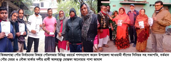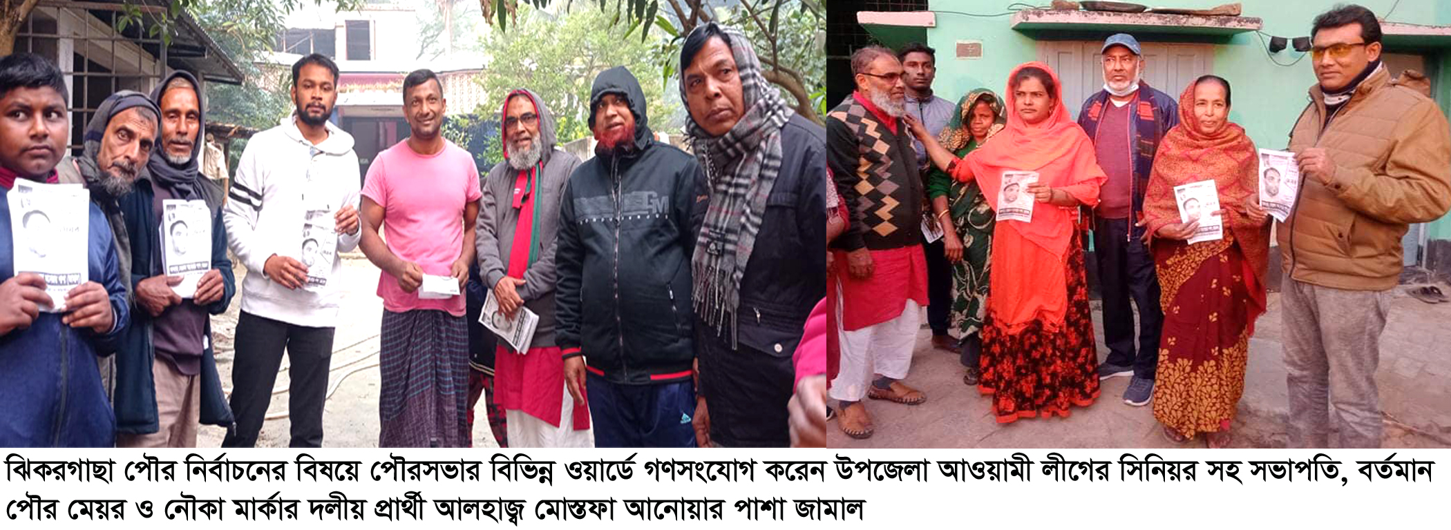 স্টাফ রিপোর্টার : আগামী ১৬ জানুয়ারী আসন্ন যশোরের ঝিকরগাছা পৌরসভা নিবাচন অনুষ্ঠিত হবে। উক্ত নির্বাচনে উপজেলা আওয়ামী লীগের সিনিয়র সহ সভাপতি, বর্তমান পৌর মেয়র ও নৌকা মার্কার দলীয় প্রার্থী আলহাজ্ব মোস্তফা আনোয়ার পাশা জামাল বলেছেন, আমরা আপনাদের কাছে নৌকা মার্কায় ভোট চাই। দেশে শান্তি, নিরাপত্তার জন্য, দুর্নীতি দমন করার জন্য নৌকা মার্কায় ভোট চাই। তিনি বলেন, নৌকার পালে হাওয়া লেগেছে, জোয়ার উঠেছে, নৌকা মার্কার জয় হবেই নিশ্চয়ই। সোমবার সকালে পৌর নির্বাচনের বিষয়ে পৌরসভার বিভিন্ন ওয়ার্ডে গণসংযোগকালে তিনি একথা বলেন। তিনি আরো বলেন, স্বাধীনতা ও উন্নয়নের পক্ষে নৌকা মার্কায় ভোট দিয়ে বাংলাদেশের জনগণ মাতৃভাষা বাংলা ভাষায় কথা বলতে পারছে, এই নৌকা মার্কায় ভোট দিয়ে বাংলাদেশ স্বাধীনতা অর্জন করেছে। এই নৌকা মার্কায় ভোট দিয়েছিলেন বলে আজ সবার জীবনমান উন্নত হচ্ছে। জীবন যত উন্নত হচ্ছে, ছেলে-মেয়েরা সুযোগ পাচ্ছে, উচ্চশিার সুযোগ পাচ্ছে। নৌকা মার্কায় ভোট দিয়েছিলেন বলে পানির সমস্যার সমাধান হয়েছে, বিদ্যুতের সমস্যার সমাধান হয়েছে। ডিজিটাল বাংলাদেশ আপনারা পেয়েছেন, অর্থনৈতিক উন্নতি হয়েছে। এসময় তার সফর সঙ্গী থাকছেন, উপজেলা আওয়ামীলীগের সহ সভাপতি চৌধুরী রমজান শরীফ বাদশা, পৌর আওয়ামীলীগের সভাপতি জাহাঙ্গীর কবির, উপজেলা আওয়ামীলীগের সাবেক সাংগঠনিক সম্পাদক মোস্তাফিজুর রহমান মুসা, সাবেক আইন বিষয়ক সম্পাদক এ্যাড. আব্দুল কাদের আজাদ, সাবেক যুব ও ক্রিড়া বিষয়ক সম্পাদক নাসিমুল হাব্বি শিপার, উপজেলা স্বেচ্ছাসেবকলীগের আহবায়ক আবুল কালাম আজাদ, উপজেলা যুবলীগের সদস্য জুলুফকার আলী ভূট্টো, জাফিরুল হক, পৌর যুবলীগের আহবায়ক একরামুল হক খোকন, প্রেসকাবের সভাপতি এমামুল হাসান সবুজ, সাধারণ সম্পাদক ইমরান রশিদ, সাংবাদিক আফজাল হোসেন চাঁদ সহ পৌর ওয়ার্ড আওয়ামীলীগে সভাপতি, সাধারণ সম্পাদক ও সদস্যবৃন্দ।
