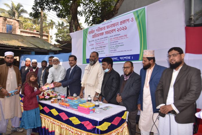 স্টাফ রিপোর্টার ॥ যশোর শহরের খাজুরা বাসস্ট্যান্ডে অবস্থিত প্রগতি আদর্শ মাদ্রাসার বার্ষিক পরীক্ষার ফল প্রকাশ ও অভিভাবক সমাবেশ অনুষ্ঠিত হয়েছে। মঙ্গলবার সকালে এ উপলক্ষে আয়োজিত অনুষ্ঠানে প্রধান অতিথি ছিলেন গ্রামের কাগজ সম্পাদক মবিনুল ইসলাম মবিন। প্রধান বক্তা ছিলেন যশোর সরকারি এমএম কলেজের সাবেক অধ্যক্ষ প্রফেসর আবু সাঈদ মোহাম্মদ রফিউদ্দিন। বিশেষ অতিথি ছিলেন উপশহর ইউনিয়নের চেয়ারম্যান এহসানুর রহমান লিটু, প্রেসকাব যশোরের সম্পাদক এসএম তৌহিদুর রহমান, সহসভাপতি নূর ইসলাম, সাংবাদিক ইউনিয়ন যশোরের সভাপতি এম. আইউব ও উপশহর ইউনিয়নের প্যানেল চেয়ারম্যান হাসান জহির। সভাপতিত্ব করেন মাদ্রাসা পরিচালনা পরিষদের সভাপতি অধ্যাপক তৌহিদুর রহমান। অনুষ্ঠান পরিচালনা করেন মাদ্রাসার পরিচালক নাজমুল হোসেন। প্রধান অতিথির বক্তৃতায় গ্রামের কাগজ সম্পাদক বলেন, মাদ্রাসা শিক্ষার গুণগত মানের পরিবর্তন করতে হবে। টিকে থাকতে হবে আন্তর্জাতিক প্রতিযোগিতায়। আর এটি করতে আরবির পাশাপাশি বাংলা ও ইংরেজির ওপর গুরুত্ব দিতে হবে। যে কাজটি প্রগতি আদর্শ মাদ্রাসা করছে। এই মাদ্রাসার শিক্ষার্থীদের বাচন ভঙ্গি মানুষের দৃষ্টি আকর্ষণ করছে বলে আমি মনে করি। ফলাফল প্রকাশের পর মেধাবী শিক্ষার্থীদের পুরস্কৃত করা হয়।