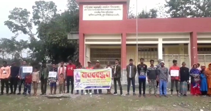 কালিয়া, (নড়াইল) প্রতিনিধি ঃ নড়াইলের কালিয়া উপজেলার নড়াগাতী থানার ঘড়িভাঙ্গা সরকারি প্রাথমিক বিদ্যালয়ের প্রধান শিক্ষক মিজানুর রহমান মোল্যার (৫৬) একাধিক অনৈতিক কর্মকান্ডের বিচার চেয়ে মানববন্ধন ও বিক্ষোভ করেছে এলাকাবাসী। ২৯ ডিসেম্বর (বুধবার) সকাল সাড়ে ১১ টায় অভিযুক্ত প্রধান শিক্ষকের অনৈতিক কর্মকান্ডের বিচার চেয়ে বিভিন্ন শ্রেনী পেশার নারী-পুরুষ ও কোমলমতি শিশুদের উপস্থিতিতে ঘড়িভাঙ্গা স্কুল চত্বরে এ মানববন্ধন ও বিক্ষোভ অনুষ্ঠিত হয়। এ সময় বিক্ষোভকারীরা ব্যানার ও ফেষ্টুন হাতে নিয়ে অভিযুক্ত প্রধান শিক্ষক মিজানুরের কঠিন শাস্তি ও বিচারের দাবি তুলে স্লোগান দেয়। মানববন্ধন ও বিক্ষোভ সমাবেশে বক্তব্যে ওই গ্রামের কালিয়া উপজেলার সাংগঠনিক কমান্ডার বীর মুক্তিযোদ্ধা আব্দুল মান্নান শেখ, বীর মুক্তিযোদ্ধা খান শহিদুর রহমান, তুহিন খান, শেখ তরিকুল ইসলাম, সাইফুল ইসলাম, রনি খান, খবির মোল্যা, ওয়াজকুরুনী, সহ একাধিক মহিলা ও শিশুরা বলেন, অভিযুক্ত প্রধান শিক্ষক এ পর্যন্ত ১১বার এ ধরনের অনৈতিক কর্মকান্ড ঘটিয়ে স্থাণীয় প্রভাবশালীদের ম্যানেজ করে বার বার পার পেয়েছে এবং অর্থদন্ডসহ লাঞ্ছিত হয়েছে অনেকবার। মহিলা শিক্ষকসহ অনেকে তার যৌন হয়রানীর কারণে অন্যত্র বদলী হতে বাধ্য হয়েছে এবং শ্লিলতা হানির শিকার অনেকে লজ্জায় এলাকা ছেড়েছে। সাম্প্রতিক ৪র্থ শেণীর একটি এতিম বাচ্চার সাথে ঘটনার পুনরাবৃত্তি হওয়ায় আমরা এলাকাবাসী ওই শিক্ষকের কঠোর শাস্তি ও বিচার দাবি করছি। বক্তারা আরো জানান, এ ঘটনায় বিগত ২১ ও ২২ ডিসেম্বর অভিযুক্ত প্রধান শিক্ষকের অনৈতিক কর্মকান্ডের খবর বিভিন্ন জাতীয় ও আঞ্চলিক পত্রিকায় প্রকাশিত হওয়ায় তথ্য দিয়ে যারা সহযোগীতা করছে তাদেরেকে চাঁদাবাজী মামলায় ফাঁসাবে বলে হুমকি দিয়েছে অভিযুক্ত ওই প্রধান শিক্ষক। মিজানুরের ভয়ে স্থাণীয় শিশুরা স্কুলে যেতে ভয় পায়। পাশের গ্রামের কোন অভিভাবক তাদের সন্তানদের ্ স্কুলে পাঠায়না। তার একাধিক অনৈতিক কর্মকান্ডের বিচার চেয়ে জেলা প্রশাসক, ইউএনও, কালিয়া ও উপজেলা শিক্ষা অফিসার বরাবরও লিখিত অভিযোগ পেশ করেছেন বলে তারা জানান।
