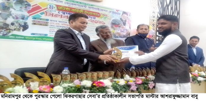 স্টাফ রিপোর্টার : যশোরের মনিরামপুর উপজেলা মিলায়তনে ফ্যামিলি সোশ্যাল ডেভেলপমেন্ট অর্গানাইজেশন (এফএসডিও) এর ৪র্থ প্রতিষ্ঠা বার্ষিকী উদ্যাপন ও স্বেচ্ছাসেবীদের মিলন মেলা-২০২১ উপলক্ষে স্বেচ্ছায় রক্তদানকারী প্রতিষ্ঠানের প্রথম কাতারে পুরস্কার পেলেন ঝিকরগাছার অরাজনৈতিক স্বেচ্ছাসেবী সংগঠন সেবা’র প্রতিষ্ঠাকালীন সভাপতি মাস্টার আশরাফুজ্জামান বাবু। শুক্রবার সকাল সাড়ে ১০টায় অনুষ্ঠানে প্রধান অতিথি মনিরামপুরের সহকারী পুলিশ সুপার আশেক সুজা মামুনের হাত থেকে এই পুরস্কার গ্রহণ করেন।