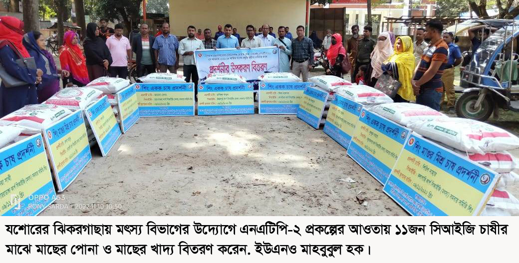 মোহাম্মদ আলী জিন্নাহ ॥ যশোরের ঝিকরগাছায় মৎস্য বিভাগের উদ্যোগে এনএটিপি-২ প্রকল্পের আওতায় ১১জন সিআইজি চাষীর মাঝে মাছের পোনা ও মাছের খাদ্য বিতরণ করা হয়েছে। বৃহস্পতিবার সকালে মাছের মাছের পোনা ও মাছের খাদ্য বিতরণের উদ্বোধন করেন ঝিকরগাছা উপজেলা নির্বাহী অফিসার মাহবুবুল হক। এসময় উপস্থিত ছিলেন, উপজেলা মহিলা ভাইস চেয়ারম্যান লুবনা তাক্ষী, সিনিয়র উপজেলা মৎস্য অফিসার এস এম শাহাজাহান সিরাজ, বীর মুক্তিযোদ্ধা মোঃ লিয়াকত আলী, সহকারী মৎস্য অফিসার মোঃ নান্নু রেজা, মৎস্য সম্প্রসারণ অফিসার সত্যজিৎ সাহা, উপজেলা মৎস্যজীবী লীগের সদস্য সচিব রফিকুল ইসলাম, ক্ষেত্র সহকারী রুহুল আমীনসহ লিফবৃন্দ ও সুফলভোগী মৎস্যচাষীবৃন্দ।