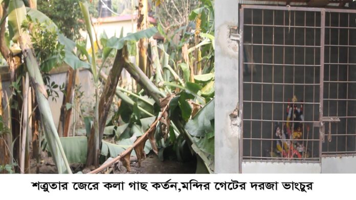 স্টাফ রিপোর্টারঃ যশোরের মণিরামপুরে পূর্ব শত্রুতার জের ধরে কলা গাছ কর্তন,মন্দির গেটের দরজা ভাংচুরের অভিযোগ উঠেছে। শুক্রবার রাতে মণিরামপুর পৌরসভার ১নং ওয়ার্ডের হাকোবা এলাকায় সাধন কুন্ডুর বসত বাড়ীতে ঘটনা টি ঘটে।