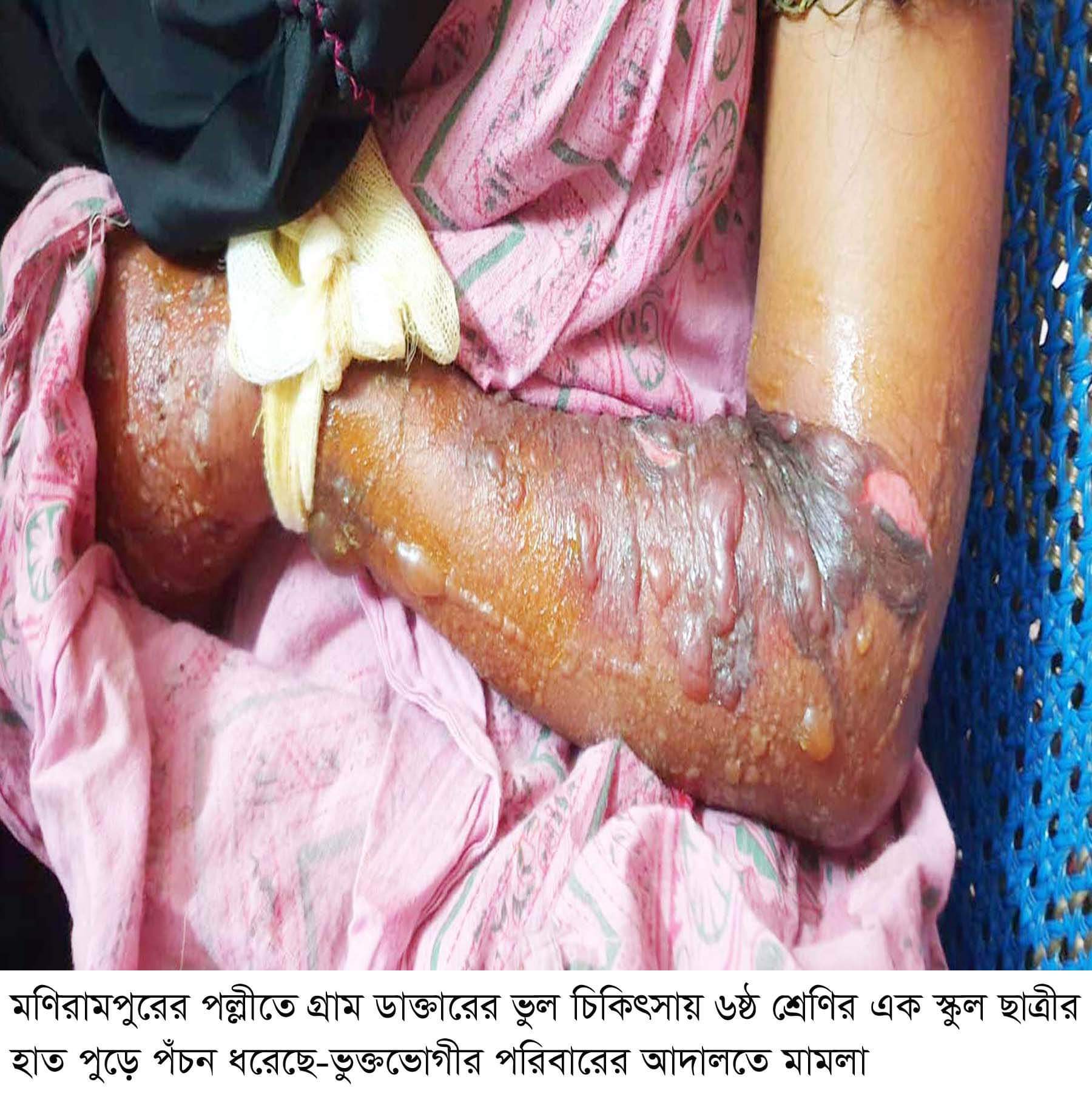 আনিছুর রহমান:- মণিরামপুরে নজরুল ইসলাম নামে এক গ্রাম ডাক্তারের ভুল চিকিৎসায় ৬ষ্ঠ শ্রেণির এক ছাত্রীর হাতে পঁচন ধরে পঙ্গুত্ব হবার উপক্রম হয়েচে। সে উপজেলার রোহিতা গ্রামের আমিনুর রহমানের কন্যা ও রোহিতা মাধ্যমিক বিদ্যালয়ের ৬ষ্ঠ শ্রেণির শিক্ষার্থী। হাত পঁচনের কারণে বর্তমানে ওই শিক্ষার্থীর শারীরিক অবস্থার ক্রমেই অবনতি হচ্ছে। অভিযুক্ত গ্রাম্য ডাক্তারের বিচার চেয়ে আদালতে মামলা করেছেন শিক্ষার্থীল পিতা আমিনুর। যশোর আদালতের বিজ্ঞ সিনিয়র জুডিশিয়াল ম্যাজিস্ট্রেট সম্পা বসু মামলাটি আমলে নিয়ে পিবিআই যশোরকে তদন্তপূর্বক প্রতিবেদনের প্রদনের নির্দেশ দিয়েছেন।