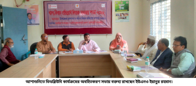 আশাশুনি (সাতক্ষীরা) প্রতিনিধি ঃ আশাশুনিতে ভিডব্লিউবি কার্যক্রমের আওতায় উপকারভোগী বাছাই, নির্বাচন, খাদ্য ও কার্ড বিতরণ সংক্রান্ত অবহিতকরণ সভা অনুষ্ঠিত হয়েছে। সোমবার সকাল সাড়ে ১০ টায় উপজেলা পরিষদ মিলনায়তনে উপজেলা মহিলা বিষয়ক অধিদপ্তরের আয়োজনে সভায় সভাপতিত্ব করেন, উপজেলা নির্বাহী কর্মকর্তা মু. ইয়ানুর রহমান। উপজেলা প্রশাসন ও উপজেলা পরিষদের সার্বিক সহযোগীতায় বিশেষ অতিথি ছিলেন উপজেলা ভাইস চেয়ারম্যান অসিম বরণ চক্রবর্তী ও মোসলেমা খাতুন মিলি। মহিলা বিষয়ক কর্মকর্তা সাইদুর রহমানের উপস্থাপনায় আলোচনায় অংশ গ্রহন করেন, ইউপি চেয়ারম্যান আল. আবু দাউদ, দীপঙ্কর কুমার সরকার দীপ, রুহল কুদ্দুস, প্রভাষক দীপঙ্কর বাছাড় দীপু, মাওঃ আবুবক্কর সিদ্দিক, সাবেক মুক্তিযোদ্ধা কমান্ডার আব্দুল হান্নান, আশাশুনি প্রেসকাবের সভাপতি এস.এম আহসান হাবিব, প্যানেল চেয়ারম্যান মোজাম্মেল হকসহ বিভিন্ন ইউনিয়ন পরিষদের সচিববৃন্দ। সভায় ভালনারেবল উইমেন বেনেফিট (ভিডব্লিউবি) কার্যক্রমের আওতায় ১ জানুয়ারী ২০২৩ থেকে ৩১ ডিসেম্বর ২০২৪ চক্রের ভিডব্লিউবি উপকারভোগী বাছাই/নির্বাচন, খাদ্য ও কার্ড বিতরণ সংক্রান্ত বিষয়ে আলোচনা ও সিদ্ধান্ত গৃহিত হয়।