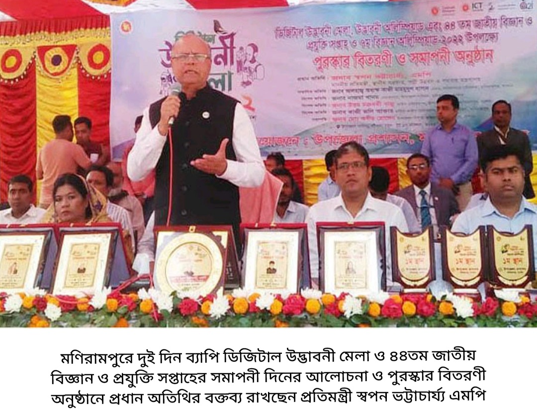 বৃহস্পতিবার (১৭ নভেম্বর-২০২২) দুপুরে মণিরামপুর উপজেলা প্রশাসন কতৃক উপজেলা পরিষদের বটতলা চত্বরে আয়োজিত দুই দিন ব্যাপি ডিজিটাল উদ্ভাবনী মেলা ও ৪৪তম জাতীয় বিজ্ঞান ও প্রযুক্তি সপ্তাহ ২০২২ এর সমাপনী দিনের আলোচনা ও পুরস্কার বিতরণী অনুষ্ঠানে প্রধান অতিথির বক্তব্যে তিনি এসব কথা বলেন।