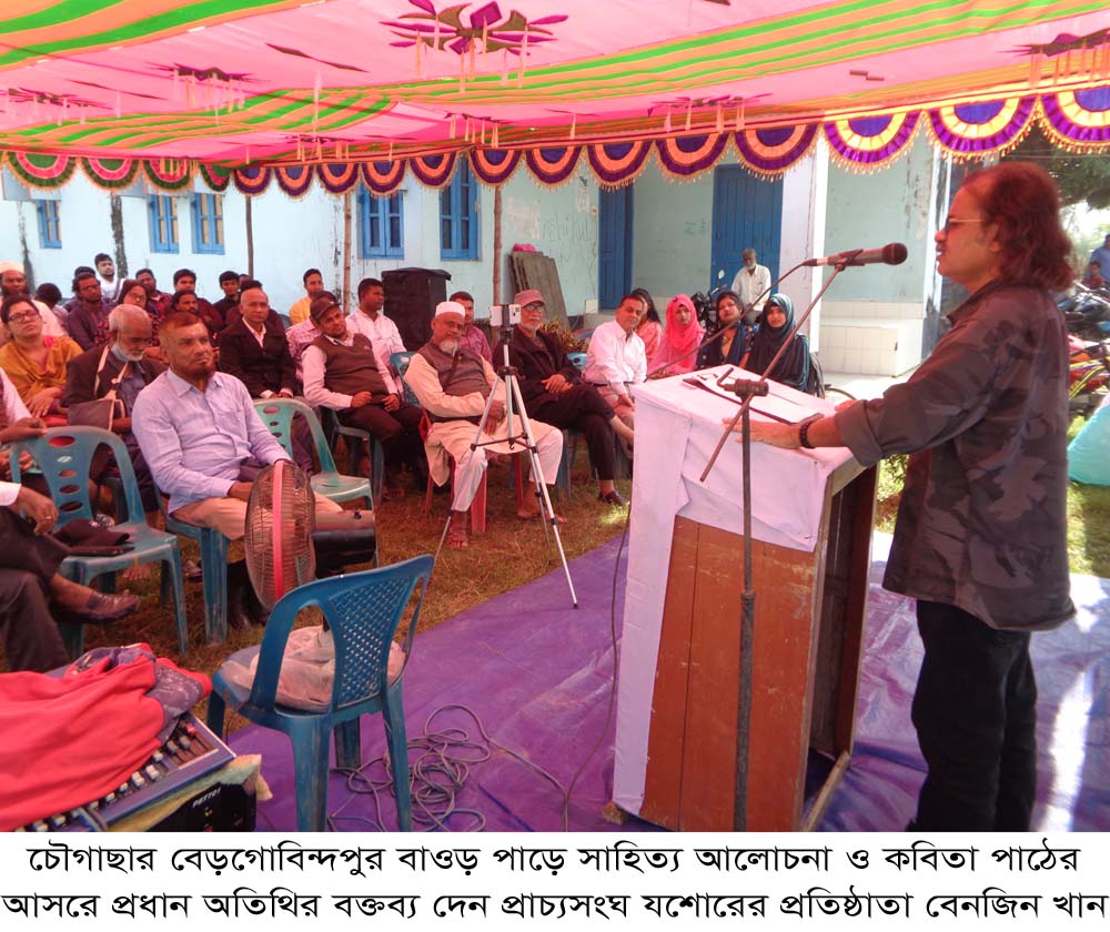 চৌগাছা (যশোর) প্রতিনিধি ॥ যশোরের চৌগাছায় সাহিত্য সমাহারের আয়োজনে সাহিত্য আলোচনা ও কবিতা পাঠের আসর অনুষ্ঠিত হয়েছে। শুক্রবার দিনব্যাপী উপজেলার বেড়গোবিন্দপুর বাওড় পাড়ে সবুজের সমাহার আর পানির ঢেউ এর শব্দ বেষ্টিত এক মনোরম পরিবেশে এই আসর অনুষ্ঠিত হয়। চৌগাছা তরিকুল ইসলাম পৌর কলেজের হিসাব বিজ্ঞান বিভাগের প্রভাষক শামীম হোসেনের সভাপতিত্বে সাহিত্য আলোচনায় প্রধান অতিথির বক্তব্য দেন প্রাচ্যসংঘ যশোরের প্রতিষ্ঠাতা বেনজিন খান।