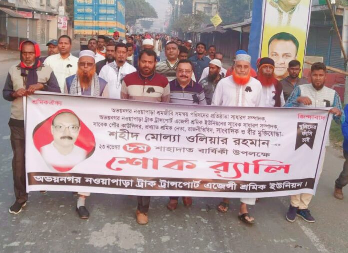 স্টফ রিপোর্টার : নওয়াপাড়া শ্রমজীবি সমন্বয় পরিষদের আয়োজনে সন্ত্রাসীর গুলিতে নিহত নওয়াপাড়া শ্রমজীবী সমন্বয় পরিষদের প্রতিষ্ঠাতা সাধারন সম্পাদক , অভয়নগর নওয়াপাড়া ট্রাক ট্রান্সপোর্ট এজেন্সী শ্রমিক ইউনিয়নের প্রতিষ্ঠাতা সাধারন সম্পাদক, দৈনিক জন্মভূমি পত্রিকার নওয়াপাড়া অফিস প্রধান বীর মুক্তিযোদ্ধা, মোল্যা ওলিয়ার রহমানের ৮ম মৃত্যু বার্ষিকী উপলক্ষে বুধবার সকালে এক শোকর‌্যালি,স্মরণসভা ও দোয়া মাহফিল অনুষ্ঠিত হয়। শোক র্যালিটি নওয়াপাড়া বাজার ঘুরে পৌরসভার সিরাজকাঠি গ্রামে মোল্যা ওলিয়ার রহমানের কবর চত্বরে সমবেত হয়ে সংগঠনের পক্ষ থেকে ফুলেল শ্রদ্ধা নিবেদন করা হয়। সেখানে এক সংক্ষিপ্ত সমাবেশে বক্তব্য রাখেন, অভয়নগর উপজেলা আ,লীগের সভাপতি আলহাজ্ব এনামুল হক বাবুল,বিশেষ অতিথি হিসেবে বক্তব্য রাখেন অভয়নগর নওয়াপাড়া ট্রাক ট্রান্সপোর্ট এজেন্সী শ্রমিক ইউনিয়নের সাধারণ সম্পাদক আলহাজ্ব ইব্রাহিম হোসেন বিশ্বাস প্রমুখ। সমাবেশ শেষে দোয়া মাহফিল অনুষ্ঠিত হয়।