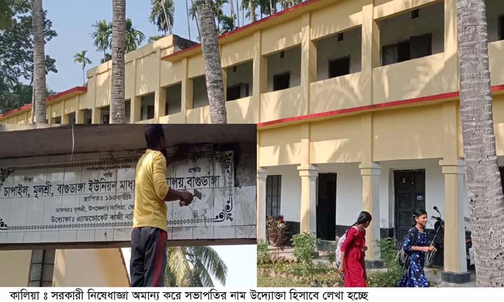 মোঃ হাচিবুর রহমান, কালিয়া (নড়াইল) প্রতিনিধিঃ নড়াইলের কালিয়া উপজেলার নড়াগাতী থানার সিএমবি (চাপাইল, মুলশ্রী, বাগুডাঙ্গা) মাধ্যমিক বিদ্যালয়ে সরকারী নিষেধাজ্ঞা অমান্য করে গেইটে সভাপতির নাম লেখার অভিযোগ উঠেছে। বিষয়টি এলাকায় বেশ সমালোচিত হয়ে উঠেছে। ২২ নভেম্বর (মঙ্গলবার) দুপুরে সরেজমিনে গেলে দেখা যায় গেইটে ম্যানেজিং কমিটির নেতৃত্বে উদ্যোক্তা হিসেবে ম্যানেজিং কমিটির সভাপতি এ্যাডঃ নাফিউল মজিদের নাম বসানোর কাজ চলছে। প্রধান শিক্ষক মাহফুজা খাতুন জানান, ৯৬ লক্ষ টাকা ব্যায়ে ২০২০ সালের মাঝামাঝি ঠিকাদারী প্রতিষ্ঠান রাফিদ ট্রেডার্স স্কুলের বাউন্ডারী ওয়াল, গেইট ও অন্যান্য কাজ শুরু করে। বাউন্ডারী ওয়ালের কাজ শেষ হয়েছে রং করা এখনো বাকী আছে। কমিটির সদস্যদের সমন্বয়ে রেজুলেশনের মাধ্যমে সাইডের পকেট গেইটে উদ্যোক্তা হিসাবে সভাপতির নাম লোখায় সরকারী নিষেধাজ্ঞা আসলে তিনি কাজ বন্ধ করতে গিয়ে দেখেন সম্পন্ন হয়ে গেছে। অভিভাবক নুরআলম কাজী জানান, এ্যাডঃ নাফিউল মজিদ সভাপতি হওয়ার পর স্কুলের উন্নয়নে অনেক কাজ করেছেন। স্কুলের বাউন্ডারী ও গেইটের জন্য তার প্রচেষ্টায় প্রায় প্রায় ১ কোটি টাকার প্রজেক্টের কাজ শেষের পথে। এ ছাড়া শহীদ মিনার ও অন্যান্য কাজের জন্য ১০ লক্ষ টাকা বরাদ্দের ব্যবস্থা করেছেন তিনি। তাকে স্কুল উন্নয়নে উৎসাহিত করার জন্য ম্যানেটিং কমিটির সদস্য ও এলাকাবাসীর সাথে পরামর্শ করে গেইটে তাঁর নাম দেওয়ার সিদ্ধান্ত হয়।
