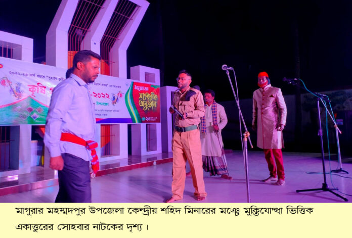 মহম্মদপুর (মাগুরা) প্রতিনিধি : মাগুরার মহম্মদপুর উপজেলা প্রশাসনের সহযোগিতা মুক্তিযোদ্ধা ভিত্তিক নাটক ‘একাত্তুরের সোহবার’ বুধবার রাতে উপজেলা কেন্দীয় শহিদ মিনারের মঞ্চে মঞ্চস্থ হয়েছে। কৃষি প্রযুক্তি মেলা উপলক্ষে উপজেলা কৃষি অধিদপ্তরের আয়োজনে একাত্তুরের সোহবার নাটকটি মঞ্চস্থ হয়।