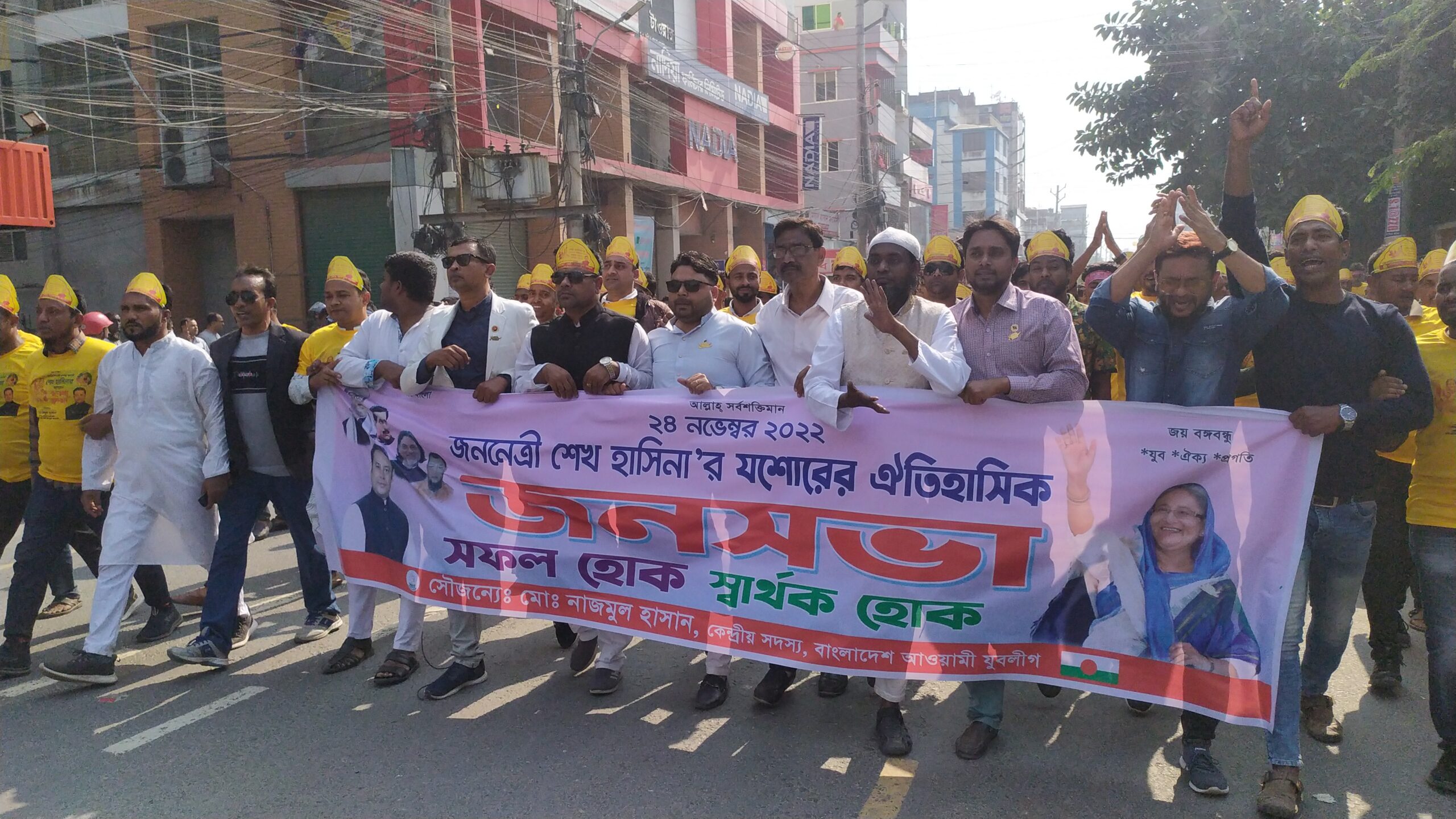 শার্শা সীমান্ত প্রতিনিধিঃ যশোরে প্রধানমন্ত্রীর জনসভাকে সাফল্য মন্ডিত করার লহ্ম্যে শার্শার গনমানুষের নেতা বাংলাদেশ আওয়ামী যুবলীগের কেন্দ্রীয় কমিটির অন্যতম সদস্য ও ঐতিহ্যবাহী নাভারন ডিগ্রী কলেজের সভাপতি জনাব নাজমুল হাসানের দিকনির্দেশনা মোতাবেক ৮ নং বাগআঁচড়া ইউনিয়ন পরিষদের চেয়ারম্যান আব্দুল খালেক, শার্শা উপজেলা ছাত্রলীগের সাবেক সভাপতি সরদার শাহরিন আলম বাদল, উপজেলা স্বেচ্ছাসেবক লীগ যুবলীগের যুগ্ন আহবায়ক হাজী বাবলু,উপজেলা যুবলীগের আহবায়ক সাইদুজ্জামান বিটন, নাভারণ ডিগ্রী কলেজ ছাত্রলীগের সাবেক সভাপতি, ফেরদ্দৌস চৌধুরী রাজু, উপজেলা মৎস্যজীবীলীগের সভাপতি অহিদুজ্জামান অহেদ, সাধারণ সম্পাদক মারুফ হোসেন, উপজেলা যুবলীগের সদস্য শফিক মাহমুদ ধাবক,কাজী সুজনের নেতৃত্বে শার্শা উপজেলার হাজার হাজার নেতা কর্মী সভাস্থলে উপস্থিত হন। বৃহস্পতিবার সকাল হতে শার্শার ১১ টি ইউনিয়নের নেতা-কর্মীরা শার্শা বাজারে দলীয় কার্যালয়ে এসে জড়ো হন। সেখান থেকে বাস।মাইক্রো,প্রাইভেটকার,সিএনজি ও মোটরসাইকেলর গাড়ি বহর নিয়ে যশোর উদ্দেশ্যে রওনা হন।এসময় প্রধানমন্ত্রীকে স্বাগত জানিয়ে নেতাকর্মীরা স্লোগান দিতে থাকে।