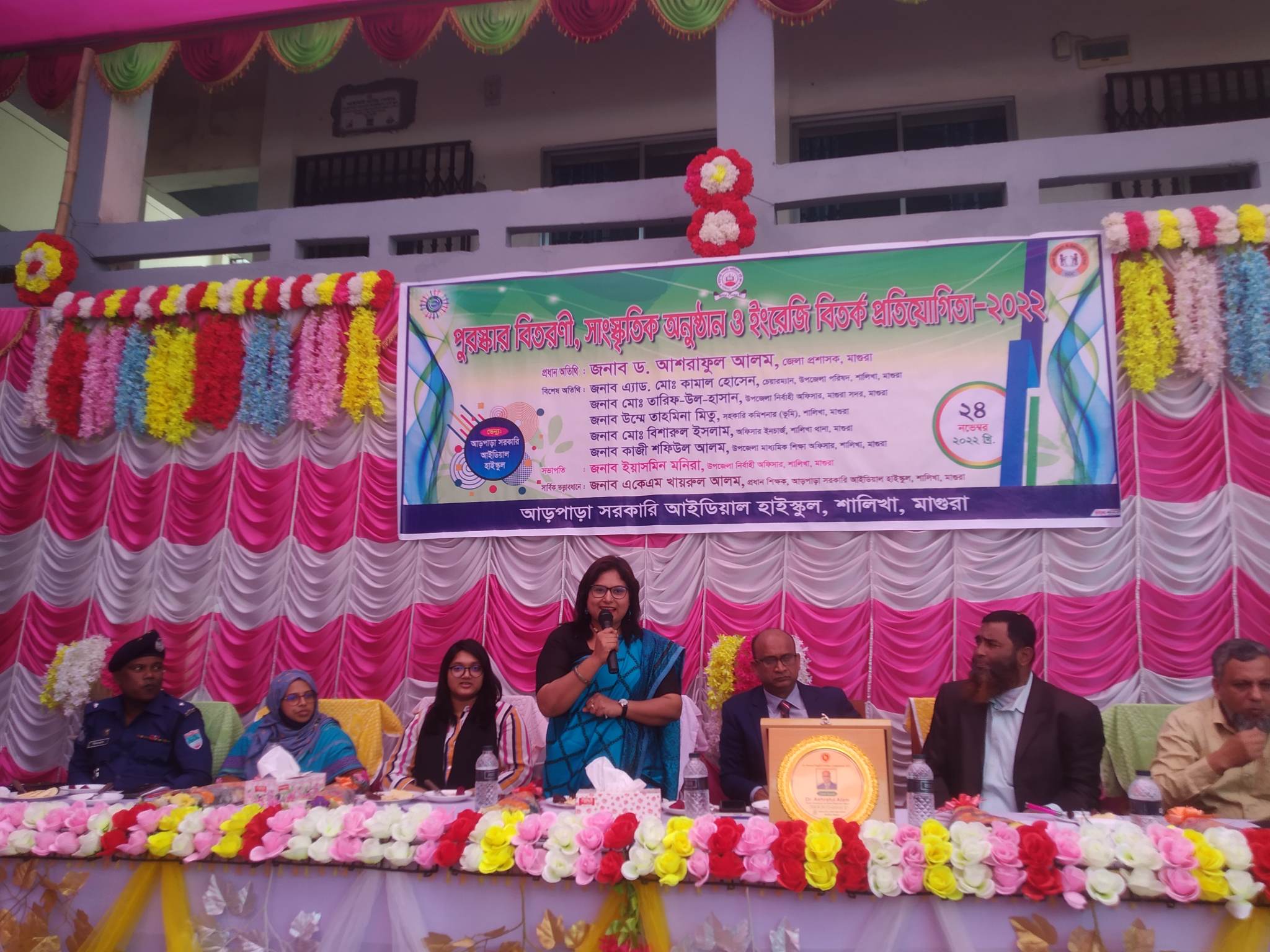 সাইফুল ইসলাম : শালিখা (মাগুরা) প্রতিনিধি: মাগুরার শালিখায় উপজেলা সদর আড়পাড়া সরকারি আইডিয়াল হাই স্কুলের আয়োজনে ইংরেজি বিতর্ক প্রতিযোগিতা ও সাংস্কৃতিক অনুষ্ঠান অনুষ্ঠিত হয়েছে। বৃহস্পতিবার সকাল ১১ টায় বিদ্যালয় চত্বরে এ উপলক্ষে আয়োজিত এক অনুষ্ঠানে উপজেলা নির্বাহী কর্মকর্তা ও বিদ্যালয়ের সভাপতি ইয়াসমিন মনিরার সভাপতিত্বে প্রধান অতিথি হিসেবে উপস্থিত ছিলেন মাগুরা জেলা প্রশাসক ড. আশরাফুল আলম। বিশেষ অতিথি হিসেবে উপস্থিত ছিলেন উপজেলা সহকারী কমিশনার ভূমি উম্মে তাহমিনা মিতু, শালিখা থানা অফিসার ইনচার্জ বিশারুল ইসলাম, উপজেলা মাধ্যমিক শিক্ষা কর্মকর্তা কাজী শফিউল আলম। অনুষ্ঠানটির সার্বিক তত্ত্বাবধানে ছিলেন বিদ্যালয়টির প্রধান শিক্ষক এ কে এম খায়রুল আলম। এছাড়াও বিদ্যালয়ের শিক্ষক-শিক্ষিকা, ছাত্র-ছাত্রী উপস্থিত ছিলেন। এসময় প্রধান অতিথির বক্তব্যে ডঃ আশরাফুল আলম বলেন, ইংরেজি একটি বিদেশী ভাষা আর এই বিদেশী ভাষাকে রপ্ত করে যে সকল শিক্ষার্থী আজ নির্ধারিত বিষয়ের উপর বিতর্ক প্রতিযোগিতা করেছে তা সত্যই প্রশংসার দাবি রাখে। অনুষ্ঠান শেষে সাংস্কৃতি ও ক্রীড়া প্রতিযোগিতা সহ নানাবিধ প্রতিযোগিতায় বিজয়ী শিক্ষার্থীদের মাঝে পুরস্কার তুলে দেন অতিথিবৃন্দ