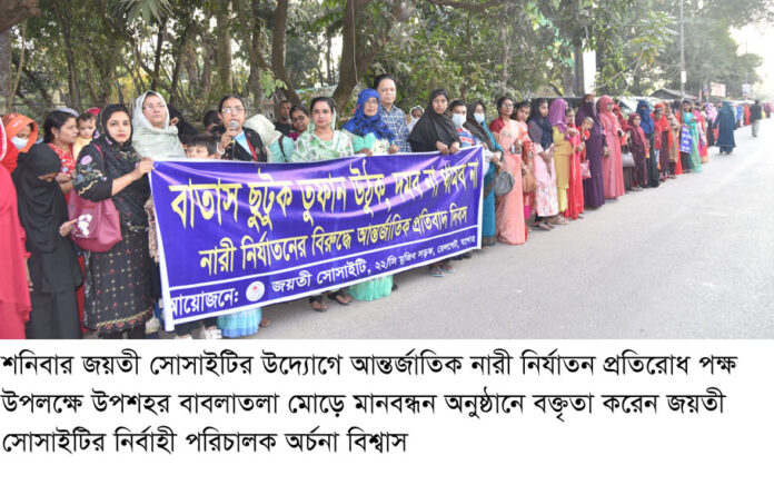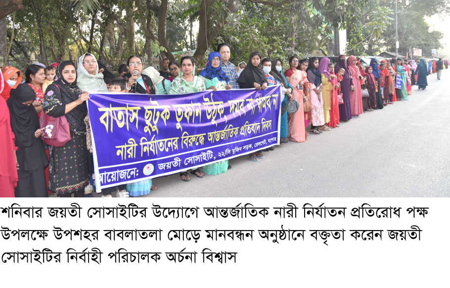 এদিন জয়তী সোসাইটির স্বাধীন মহিলা উন্নয়ন সংগঠন, শুভেচ্ছা, নতুনজীবন, নাজির শংকরপুর-২, বনানী, আলোক, সৃষ্টি, বিপ্লবী, প্রদীপ, নবদিগন্ত, বন্ধন, সেবা, সেতু, অগ্রগামী ও নিশান মহিলা উন্নয়ন সংগঠনের উদ্যোগে বেজপাড়া তালতলায় মানববন্ধন অনুষ্ঠিত হয়। এতে সভাপতিত্ব করেন স্বাধীন মহিলা উন্নয়ন সংগঠনের সম্পাদক শাহিনা রহমান। প্রধান অতিথি ছিলেন অর্নিবান কাব যশোরের সভাপতি প্রকৌশলী শহিদুল হক বাদল। বিশেষ অতিথি ছিলেন জয়তী সোসাইটির উপদেষ্টা চন্দন বিশ^াস, রিসার্স এন্ড ডেভেলপমেন্ট কর্মকর্তা সুদীপ্ত প্লাবন, সমাজসেবক আল সুফিয়ান আনন, অনির্বান কাবের আজীবন সদস্য ডাক্তার আবুল হোসেন, যশোর কচিকাঁচা পরিষদের সাংগঠনিক সংগঠক রফিকুল ইসলাম, বেজপাড়া কমিউনিটি পুলিশিং কমিটির সম্পাদক আলমগীর হোসেন, যশোর নারীমুক্তি পরিষদের আহবায়ক ছকিনা বেগম, জয়তী সোসাইটির পরিচালক অর্চনা বিশ^াস। সার্বিক ব্যবস্থাপনায় ছিলেন জয়তী সোসাইটির ইউনিট ম্যানেজার সিরিয়া সুলতানা রিনা। অনুষ্ঠান পরিচালনা করেন জয়তী সোসাইটির ইউনিট ম্যানেজার শারমিন নাহার।