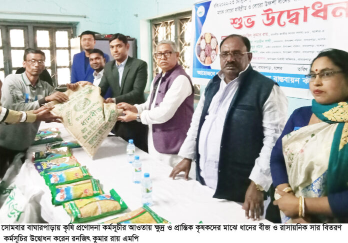 উপজেলা কৃষি অফিসের আয়োজনে সোমবার অফিসার্স ক্লাবে এ কর্মসূচির উদ্বোধন করেন রনজিৎ কুমার রায় এমপি। এ সময় উপস্থিত ছিলেন, উপজেলা নিবার্হী অফিসার সৈয়দ জাকির হাসান, উপজেলা পরিষদের ভাইস চেয়ারম্যান আব্দুর রউফ, মহিলা ভাইস চেয়ারম্যান বিথীকা বিশ্বাস ও কৃষি কর্মকতার্ রুহল আমীন প্রমুখ। এ সময় প্রধান অতিথি রনজিৎ কুমার রায় বলেন, ‘কৃষকরা যথাযথ চাষাবাদ করলে একদিকে বোরো ধানের ফলন বৃদ্ধি পাবে, অন্যদিকে কৃষকরা খাদ্য চাহিদা মেটানোসহ অর্থনৈতিকভাবে লাভবান হবেন ।’ সংশ্লিষ্ট অফিস সূত্রে জানা যায় , ৪ হাজার ৭শ ৭০ জন কৃষক ১০ কেজি এমওপি, ১০ কেজি ডিএপি এবং ৫ কেজি করে বোরো ধানের বীজ ও ২ হাজার ২শ ৭৫ জন কৃষক ২ কেজি করে হাইব্রীড ধানের বীজ কৃষকদের মাঝে বিতরণ করা হবে।