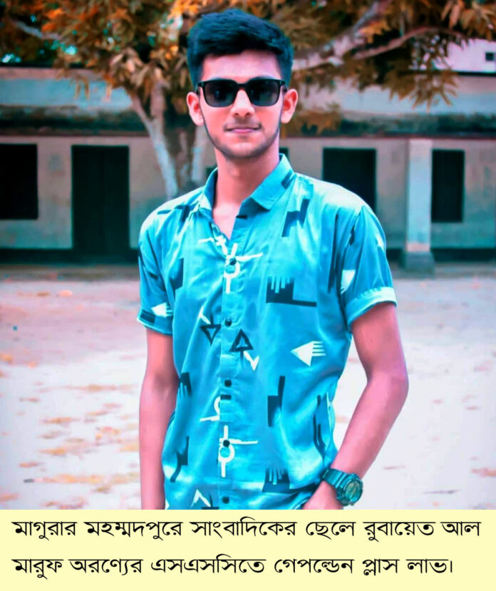 মহম্মদপুর (মাগুরা) প্রতিনিধি : রুবায়েত আল মারুফ অরণ্য মাগুরার মহম্মদপুরের ঐতিহ্যবাহী শিক্ষা প্রতিষ্ঠান সরকারি আর এস কে এইচ ইনস্টিটিউশন থেকে ২০২২ সালের এসএসসি পরীক্ষায় অংশগ্রহণ করে গোল্ডেন প্লাস পেয়েছে। সে দৈািনক ভোরের কাগজ, দৈনিক যশোর পত্রিকার মহম্মদপুর উপজেলা প্রতিনিধি ও সাপ্তাহিক মহম্মদপুর বার্তার নির্বাহী সম্পাদক মুরাদ হোসেন এবং সালমা হোসেনের একমাত্র ছেলে।