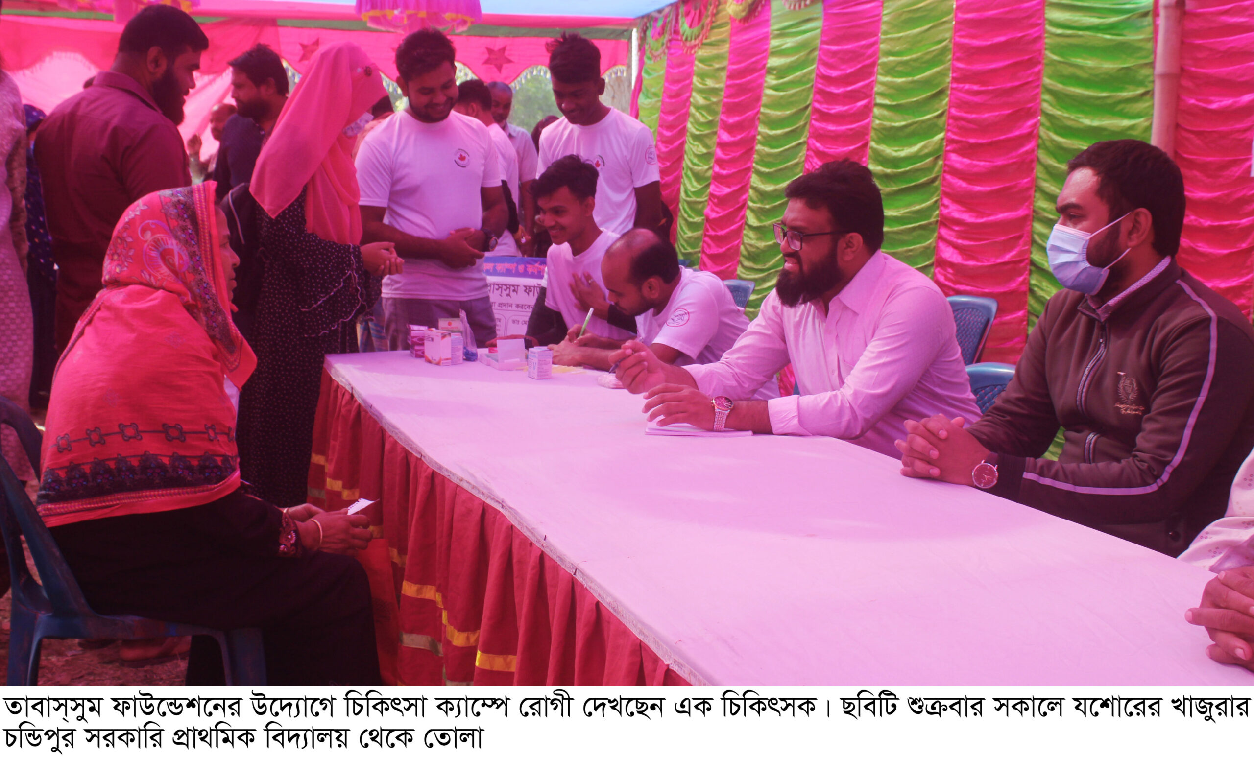 খাজুরা (যশোর) প্রতিনিধি : যশোরের খাজুরায় স্বেচ্ছসেবী সংগঠন তাবাস্সুম ফাউন্ডেশনের উদ্যোগে বিনামূল্যে চিকিৎসা ক্যাম্প অনুষ্ঠিত হয়েছে। শুক্রবার (২ ডিসেম্বর) স্থানীয় চন্ডিপুর সরকারি প্রাথমিক বিদ্যালয় মাঠে এ ক্যাম্প অনুষ্ঠিত হয়। দিনব্যাপী চলা কর্মসূচিতে সহযোগিতা করে মাক্স মেডিকেল সার্ভিসেস ও স্বেচ্ছাসেবী সংগঠন কে আর এস হেল্পিং হ্যান্ড ফাউন্ডেশনের শতাধিক সদস্যরা। যশোর মেডিকেল কলেজ হাসপাতাল ও বেসরকারি কয়েকটি ক্লিনিকের বিভিন্ন বিভাগের বিশেষজ্ঞ ১১ জন চিকিৎসক রোগীদের ব্যবস্থাপত্র দেন। ক্যাম্পে প্রায় সহ¯্রাধিক নারী-পুরুষ ও শিশুকে সেবা দেওয়া হয়। এদিন সকালে ১০টায় চিকিৎসা শিবিরের উদ্বোধন করেন, তাবাস্সুম ফাউন্ডেশনের সভাপতি কানাডা প্রবাসী মাসুম হোসেন। এ বাংলাদেশ গ্রাম ডাক্তার কল্যাণ সমিতি যশোর জেলার সাধারণ সম্পাদক আব্দুল মান্নান বিশ^াস, চন্ডিপুর মাধ্যমিক বিদ্যালয়ের সহকারী শিক্ষক মাও. আব্দুর রাজ্জাক, অবসরপ্রাপ্ত মাদরাসা শিক্ষক আহম্মদ আলী, সাংবাদিক মুন্সী মনিরুজ্জামানসহ অনেকে উপস্থিত ছিলেন। কে আর এস হেল্পিং হ্যান্ড ফাউন্ডেশনের সভাপতি মোস্তাকিম বিন জামান বলেন, ‘নারীরা অনেক সময় নিজের স্বাস্থ্য নিয়ে তেমন ভাবেন না। কোনো সমস্যা শেষ পর্যন্ত চেপে রাখতে চেষ্টা করতে পারেন। সামাজিক দায়বদ্ধতার জায়গা থেকে বিজয়ের মাসে তাই নারীদের জন্য আমরা এই বিশেষ উদ্যোগ নিয়েছি।’