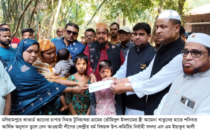 যশোর : ‘আমার সবকিছু শেষ হয়ে গেছে, আমি এখন কি করে বাঁচবো, কি করে সন্তানদের আহার যোগাবো, কেউ খোঁজ নিলো না, আপনি আমাগে মাঝে আয়ছেন, সাহায্য করতেছেন, আল্লাহ আপনার ম্যালাদিন বাঁচায় রাহুক’। কান্নাজড়িত কণ্ঠে কথাগুলো বলছিলেন মণিরামপুর উপজেলার কাভার্ড ভ্যানের চাপায় নিহত টুনিয়াঘরা গ্রামের দিনমজুর তৌহিদুল ইসলামের স্ত্রী আমেনা খাতুন। শনিবার সকালে আওয়ামী লীগের কেন্দ্রীয় ধর্ম বিষয়ক উপ-কমিটির নির্বাহী সদস্য এস এম ইয়াকুব আলী নিহত ও ক্ষতিগ্রস্থ পরিবারের খোঁজ খবর নিতে গেলে এসব কথা বলেন তিনি। এসময় এস এম ইয়াকুব আলী নিহত তৌহিদুল ইসলামের স্ত্রী আমেনা খাতুন, হাবিবুর রহমানের স্ত্রী তওহিদা খাতুন, ক্ষতিগ্রস্থ আবু তালেব, হাশেম আলী, নুরুল আমিন, ফিরোজ আহম্মেদ, রবিউল ইসলাম, বাবু ও আকবার আলীকে আর্থিক অনুদান তুলে দেন।