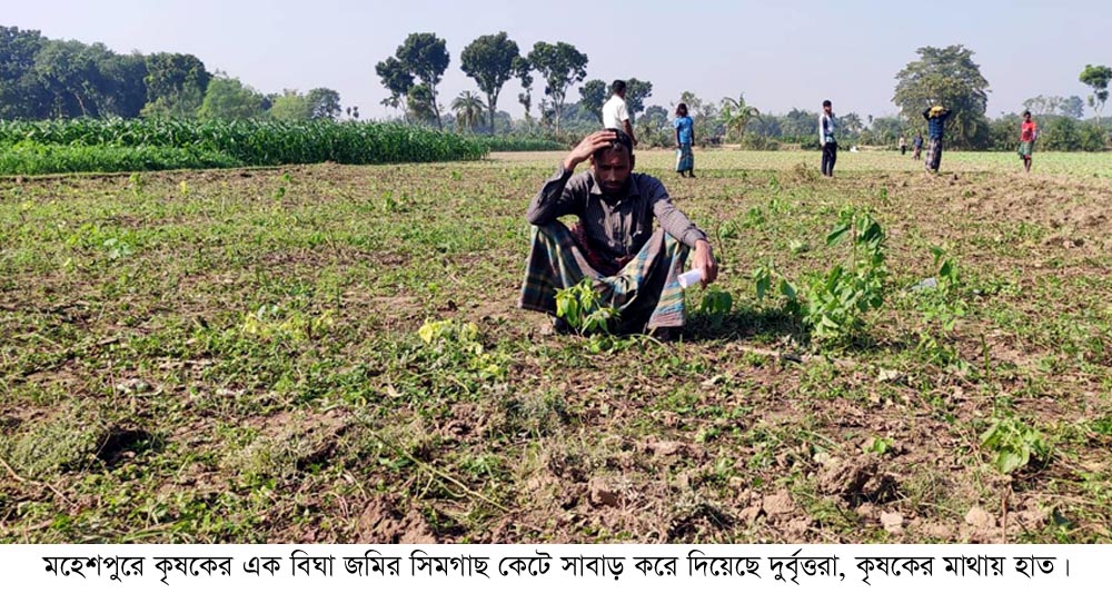 মহেশপুর(ঝিনাইদহ)অফিস ঃ ঝিনাইদহের মহেশপুরে শহিদুল ইসলাম নামে এক কৃষকের ৩৩ শতাংশ (এক বিঘা) জমির সিমগাছ কেটে সাবাড় করেছে দূর্বৃত্তরা। এতে কৃষকের প্রায় ২ লাধিক টাকার তি হয়েছে বলে জানিয়েছেন মাঠের কৃষকরা। এ বিষয়ে ভুক্তভোগী শহিদুল ইসলাম মহেশপুর থানায় একটি লিখিত অভিযোগ করেছেন।