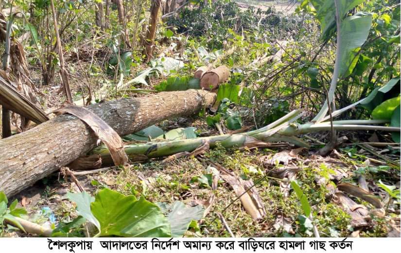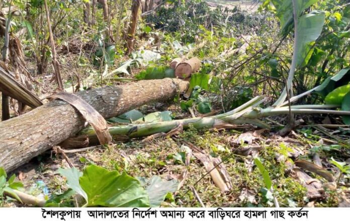 নোমান পারভেজ শৈলকূপা ঝিনাইদহ : আদালতের নির্দেশ অমান্য করে ঝিনাইদহের শৈলকুপা উপজেলার ত্রিবেনী ইউনিয়নের শ্রীরামপুর গ্রামে মিন্টু বিশ্বাস নামের এক ব্যক্তির বাড়িতে হামলা চালিয়ে তার জমি দখলের চেষ্টা, গাছপালা কর্তন ও হামলার অভিযোগ উঠেছে। বুধবার (০৭ ডিসেম্বর) ভুক্তভোগী ব্যক্তির ঘর ভাঙচুর ও গাছপালা কাটা হয়। উপজেলার শ্রীরামপুর গ্রামের বলয় মন্ডলের নেতৃত্বে গাছপালা কর্তন ও হামলা চালানো হয় বলে মিন্টু বিশ^াস অভিযোগ করেন।গ্রামবাসি সুত্রে জানা গেছে, জমি দখলের উদ্দেশ্যে সকালে করাত, শাবল, দা ও কুড়াল নিয়ে বলয় মন্ডলের নেতৃত্বে ৩০-৪০ জনের একটি দল মিন্টু বিশ্বাসের বাড়িতে হামলা চালায়। এসময় নারকেল, মেহগনিসহ বেশ কয়েকটি গাছ কেটে দেওয়া হয়। বাঁধা দিলে বাড়ির লোকজনকে মারধর করে। খবর পেয়ে শৈলকুপা থানার পুলিশ ঘটনাস্থলে পৌছালে হামলাকারীরা পালিয়ে যায়। এই বিষয়ে বলয় মন্ডলের সাথে কথা বলে চাইলে তিনি সাংবাদিকদের সঙ্গে কথা বলতে রাজি হননি। শৈলকুপা থানার ভারপ্রাপ্ত কর্মকর্তা (ওসি) আমিনুল ইসলাম বলেন, আদালতের নির্দেশনা উপেক্ষা করে ঘর ভাঙচুর ও গাছপালা কাটা সম্পূর্ণ বেআইনি। অভিযোগ পেলে অভিযুক্ত ব্যক্তিদের বিরুদ্ধে আইনগত পদক্ষেপ নেওয়া হবে।