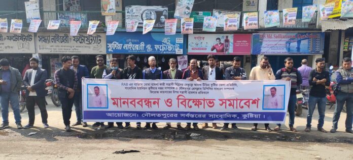 কুষ্টিয়ায় আনন্দ টিভির জেলা প্রতিনিধি উপর সন্ত্রাসী হামলা মানববন্ধন ও বিক্ষোভ সমাবেশ