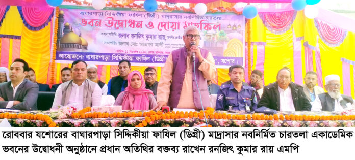 আজম খান, বাঘারপাড়া(যশোর) : যশোর-৪ আসনের সংসদ সদস্য রনজিৎ কুমার রায় বলেছেন, আমাদের বড় সম্পদ আমাদের সন্তান। বর্তমান যুগে সন্তানকে সুশিক্ষায় গড়ে তুলতে হবে। শিক্ষার কোনো বিকল্প নাই। প্রধানমন্ত্রী শেখ হাসিনা মাদ্রাসা শিক্ষাকে আধুনিক শিক্ষায় রূপান্তরিত করেছে। মাদ্রাসা শিক্ষাকে ছোট করে দেখার সুযোগ নেই।