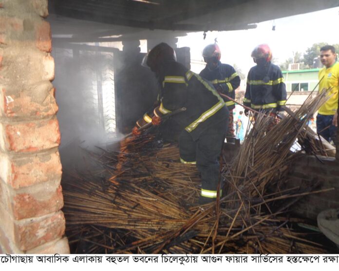 ফায়ার সার্ভিস ও স্থানীয়রা জানান, রবিবার বিকেলে বাজারস্থ্য স্বাধীনতা ভাস্কার্য মোড়ে মাদ্রসা শিক্ষক আশরাফুল ইসলামের বহুতল ভবনের চিলেকুঠায় স্থানীয়রা ধুয়ার কুন্ডলী দেখতে পাই। সঙ্গে সঙ্গে ফায়ার সর্ভিসকে খবর দেয়ার পাশাপাাশি তারা পানি দিয়ে আগুন নেভানোর কাজ করেন। এরপর ফায়ার সার্ভিসের ২টি ইউনিট এসে আগুন নিয়ন্ত্রনে আনে। আগুনের ঘটনায় বড় কোন ক্ষয়ক্ষতি হয়নি বলে জানা গেছে। বাসা মালিকের ছোট বোন দুলারী খাতুন বলেন, চিলেকুঠায় রাখা পাটখড়িতে হঠাৎ করেই আগুন ধরে যায়। কেন কিভাবে আগুন ধরেছে তা বলা যাচ্ছেনা।