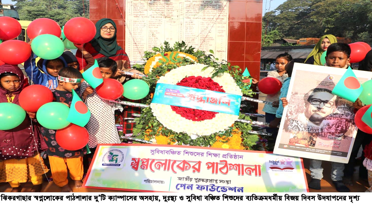 স্টাফ রিপোর্টার : মহান বিজয় দিবস-২০২২ উদযাপন উপলক্ষে যশোরের ঝিকরগাছায় যথাযথ মর্যাদায় সুবিধা বঞ্চিত শিশুদের শিক্ষাপ্রতিষ্ঠান স্বপ্নলোকের পাঠশালার কোমলমতি শিক্ষার্থীদের অংশগ্রহণে উপজেলা মোড়ে শহীদদের স্মৃতি স্তম্ভে পূষ্পমার্ল্য অর্পণ করেন। এরপরও লাল সবুজ পতাকা, নানান রঙের বেলুন-ফেষ্টুন ও বিজয় দিবস উপলে সরকার মুদ্রিত পোস্টার হাতে বিজয় স্তম্ভে একই ছন্দে একই তালে গুটি গুটি পায়ে হেটে পুস্প স্তবক অর্পণের চিত্র দেখে উপস্থিত সকলের নজর ও মন কাড়ে। জাতীয় পুরস্কারপ্রাপ্ত সংস্থা পেন ফাউন্ডেশন কর্তৃক পরিচালিত স্বপ্নলোকের পাঠশালার দু’টি ক্যাম্পাসের অসহায়, দুঃস্থ্য ও সুবিধা বঞ্চিত ৭০জন শিার্থীদের এই আয়োজনের নেতৃত্বদেন স্বপ্নলোকের পাঠশালার প্রতিষ্ঠাতা প্রধান শিক ও পেন ফাউন্ডেশনের নির্বাহী পরিচালক মেঘনা ইমদাদ। এসময় উপস্থিত ছিলেন পেন ফাউন্ডেশন ও স্বপ্নলোকের পাঠশালার শিক্ষক, কর্মকর্তা-কর্মচারীবৃন্দ।