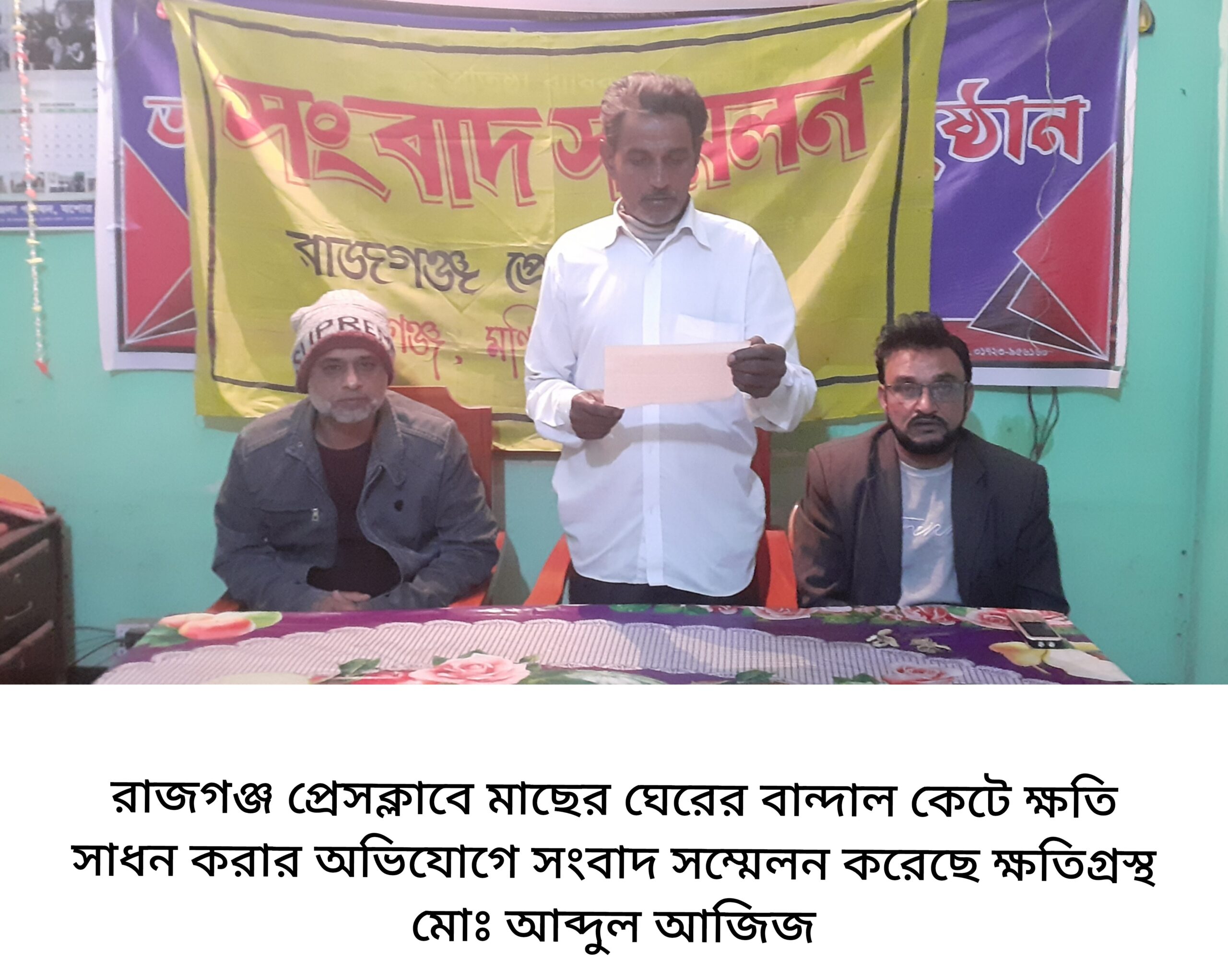 রোববার (১৮ ডিসেম্বর-২০২২) বিকালে রাজগঞ্জ প্রেসক্লাব কার্যালয়ে সংবাদ সম্মেলনে মোঃ আব্দুল আজিজ জানান- রাজগঞ্জ বাজার সংলগ্ন মাষ্টারপাড়ার পিছনে মোবারকপুর মৌজায় আমার ক্রয়কৃত ৮০ শতকসহ এলাকার বিভিন্ন লোকজনের কাজ থেকে প্রায় ১০ বিঘা জমি বর্গা নিয়ে ২০০৮ সাল থেকে মাছ চাষ করে আসছি। আমার মাছের ঘের দেখে গাত্রদাহ শুরু হয় আমারই ভাই মোশারফ হোসেন মোশা, তার স্ত্রী শেফালী বেগম, মেয়ে শাবানা ও ছেলে আশরাফুল ইসলাম হজুসহ তার পরিবারের। পূর্বশত্রুতার জেরধরে পায়ে পা দিয়ে ঝগড়া করার জন্য তারা আমার মাছের ঘেরের পাশে ছোট একটি ঘের নির্মাণ করে। মাছের ঘের নির্মাণ করার পর থেকে আমার ভাই ও তার পরিবার আমার উপর শারীরিক ও মানষিক নির্যাতন করে আসছে। এতেও সুবিধা করতে না পেরে তারা রাতের অন্ধকারে আমার মাছের ঘের থেকে মাছ লুট করে। বিষয়টি আমি জানতে পেরে আমার ভাইয়ের কাছে জিজ্ঞাসা করলে আমার ভাইসহ তার পরিবারের সকল সদস্যরা আমাকে এলোপাতাড়ি মারপিট করে রক্তাক্ত জখম করে। এরপর আমি হাসপাতালে চিকিৎসাধীন থাকা অবস্থায় সম্প্রতি তারা কয়েকদফায় এক ট্রাক মাছ লুট করে নিয়ে যায়। যার আনুমানিক মূল্য ১ লক্ষ্য টাকা।