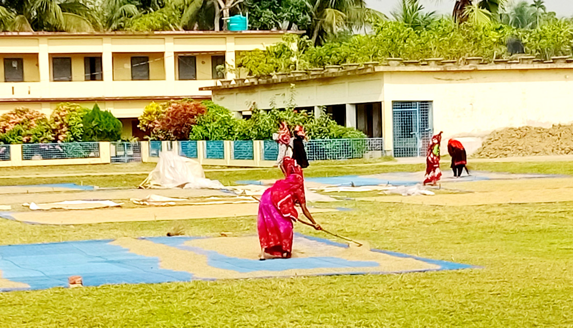 কৃষাণী সাবিনা ইয়াসমিন ও সাজেদা বেগম বলেন- আমন ধান কাটা, ঝাঁড়া-ঝুঁড়া হয়ে গেছে। খাওয়ার ধান রেখে বাকি ধান বিক্রি করাও হয়েগেছে। ছয় মাসের জন্য ঘরের চাল তৈরি করতে হবে। তাই ভোররাতে ধান সিদ্ধ করেছি। সিদ্ধ করা ধান এই স্কুল মাঠে শুকাচ্ছি।