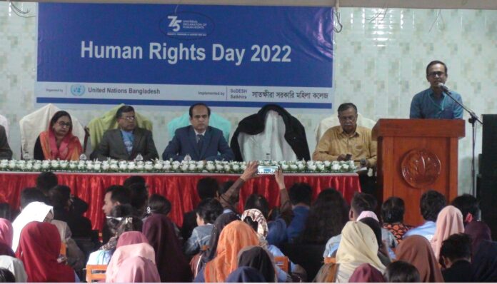 সাতক্ষীরার প্রতিনিধি ঃ সাতক্ষীরায় মানবাধিকারের সার্বজনীন ঘোষণার ৭৫ বছর ও মানবাধিকার দিবস-২০২২ উপলক্ষে র‌্যালি ও আলোচনা সভা অনুষ্ঠিত হয়েছে। জাতিসংঘ বাংলাদেশের সহযোগিতায় বৃহস্পতিবার বেলা ১১ টায় সাতক্ষীরা সরকারি মহিলা কলেজের হল রুমে অনুষ্ঠিত আলোচনা সভায় প্রধান অতিথির বক্তব্য রাখেন, সাতক্ষীরা সরকারী মহিলা কলেজের অধ্যক্ষ বাসুদেব বসু।