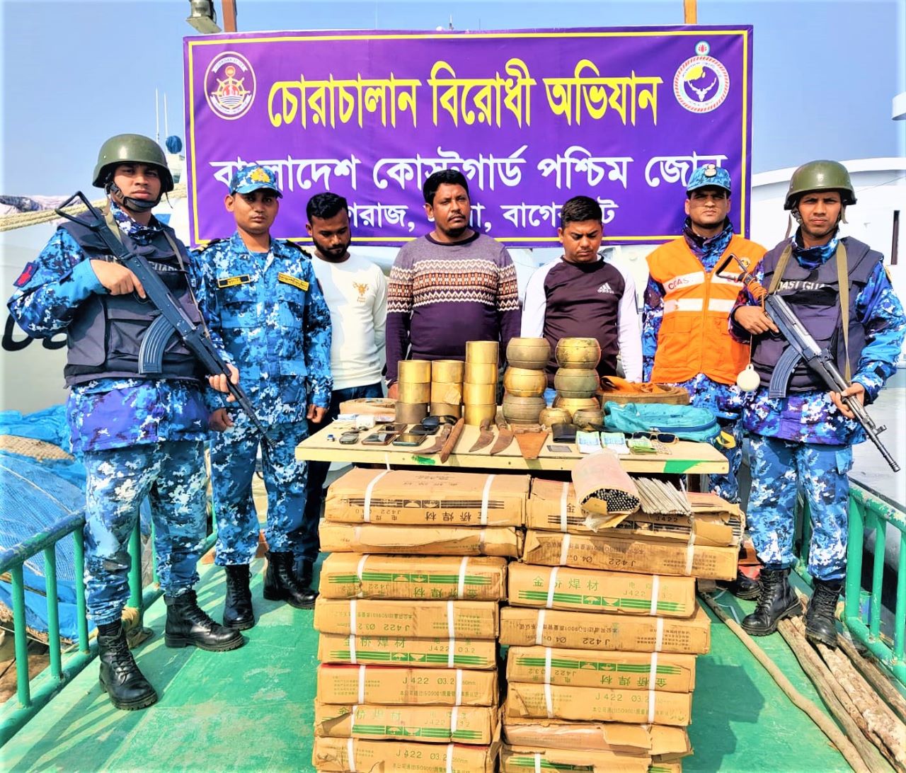 এসময় একটি বিদেশি বাণিজ্যিক জাহাজ থেকে পাচার করে আনা মেশিনারিজ পণ্য যা (গোল্ডেন ব্রিজ ওয়েল্ডিং মেটারিয়াল ২২ বক্স, মেটালিক ফ্যান লোবার ৯টি, জয়েন্ট বুশ ১০টি, ও ১টি ইঞ্জিন চালিত বোট বোঝাই করে কোস্টগার্ড দেখে দ্রæত পালিয়ে যাওয়ার সময় ধাওয়া করে এগুলো জব্দ করা হয়। এসময় অবৈধ এ কাজের সাথে জড়িত মোংলা পোর্ট পৌর শহরের বাসিন্দা পাচারকারী আল-আমিন (৩৪), আশিক (৩২) ও আরিফ (২৮) এ তিন জনকে আটক করা হয়। পরে তাদের তল্লাশী করে নগদ ১ লাখ ৩২ হাজার ১৬০ টাকা ও ইয়াবা সেবনের ফয়েল পেপার উদ্ধার করে কোস্টগার্ড। আটক কৃতদের মধ্যে আল-আমিন ও আশিককে শুক্রবার রাতে মামলা দায়ের শেষে মোংলা থানায় হস্তান্তর করলে আজ তাদের আদালতের মাধ্যমে জেল হাজতে পাঠানো হয়েছে বলে জানায় পুলিশ।