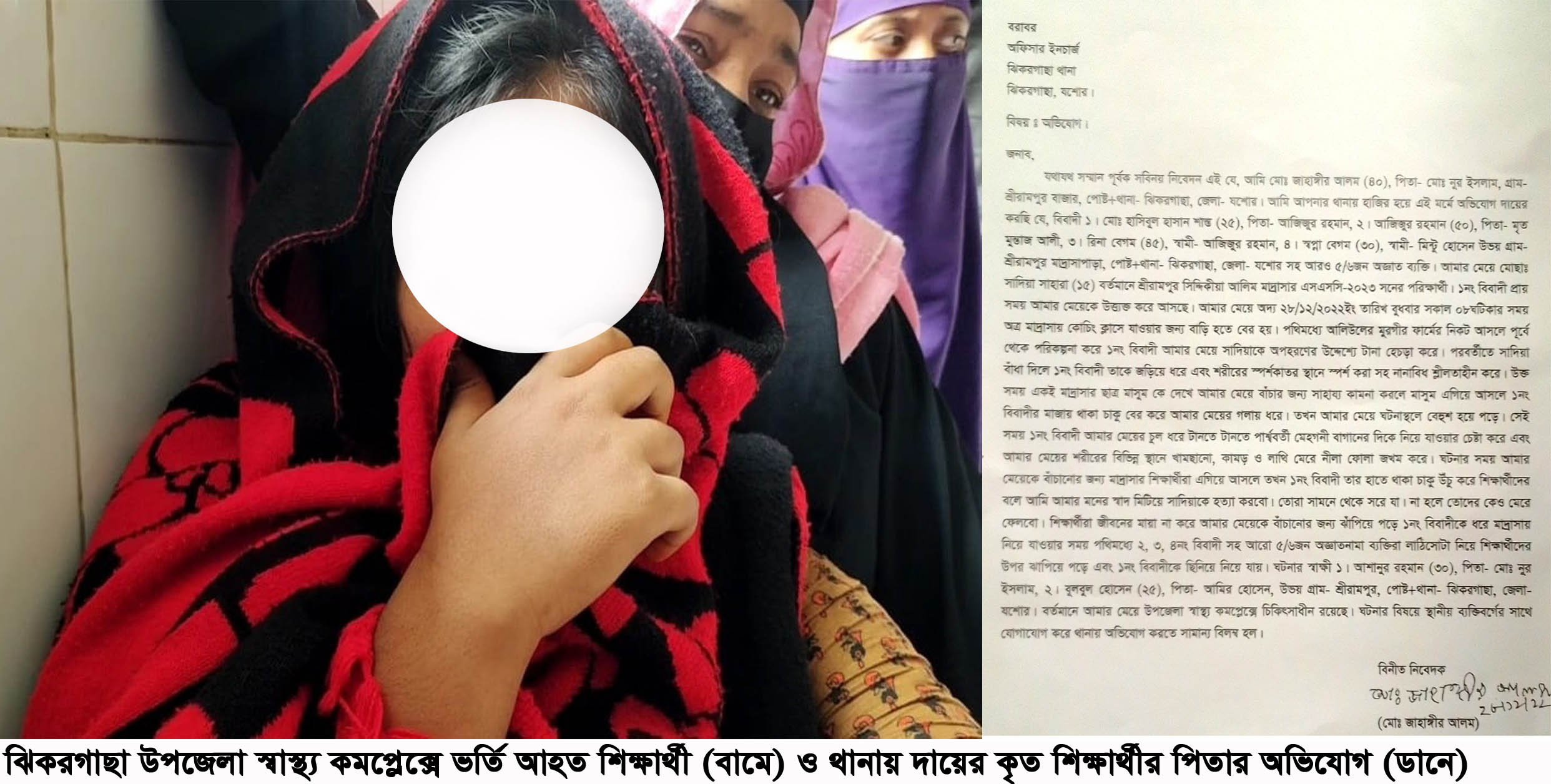 স্টাফ রিপোর্টার : যশোরের ঝিকরগাছা উপজেলার সদর ইউনিয়নের শ্রীরামপুর সিদ্দিকীয়া আলিম মাদ্রাসার এক শিক্ষার্থীকে শ্লীলতাহানি করায় ৪জনকে বিবদী করে সন্ধ্যার সময় থানায় লিখিত অভিযোগ দায়ের করেছে ঐ শিক্ষার্থীর পিতা মোঃ জাহাঙ্গীর আলম (৪০)। অভিযোগে বিবাদীরা হলেন, শ্রীরামপুর মাদ্রাসাপাড়া গ্রামের আজিজুর রহমানের ছেলে মোঃ হাসিবুল হাসান শান্ত (২৫), মৃত মুন্তাজ আলীর ছেলে আজিজুর রহমান (৫০), আজিজুর রহমানের স্ত্রী রিনা বেগম (৪৫), মিন্টু হোসেনের স্্রী স্বপ্না বেগম (৩০) সহ আরও ৫/৬জন অজ্ঞাত ব্যক্তি।