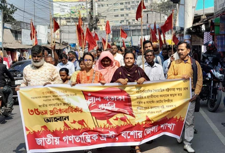 আজ ৫ ফেব্রুয়ারি ২০২৩ রবিবার দুপুর সাড়ে ১২টায় যশোর জেলা কার্যালয় থেকে জাতীয় গণতান্ত্রিক ফ্রন্ট যশোর জেলা কমিটির উদ্যোগে এক লাল পতাকার র্যালি শহর প্রদক্ষিণ করে। সংগঠনের ৩৫তম প্রতিষ্ঠা বার্ষিকী উপলক্ষ্যে দেশব্যাপি কর্মসূচির অংশ হিসেবে র্যালিটি পাইপপট্টি মোড় থেকে শহর প্রদক্ষিণ করে যশোর প্রেসক্লাবের সামনে সংক্ষিপ্ত সমাবেশের মাধ্যমে শেষ হয়। জেলা ভারপ্রাপ্ত সভাপতি আশুতোষ বিশ্বাসের সভাপতিত্বে সমাবেশে বক্তব্য রাখেন সাধারণ সম্পাদক হাফিজুর রহমান, সাংগঠনিক সম্পাদক সমীরণ বিশ্বাস ও সদর থানা কমিটির সভাপতি শাহরিয়ার আমির প্রমুখ। পরিচালনা করেন জেলা সহ-সাধারণ সম্পাদক কামরুল হক লিকু। সমাবেশে বক্তারা বলেন, সাম্রাজ্যবাদ ও দালালদের স্বার্থরক্ষাকারী নয়াউপনিবেশিক বাংলাদেশে কখনই গণতন্ত্র ছিল না। দেশ পরিচালিত হয় সাম্রাজ্যবাদী নীতি-নির্দেশে। নির্বাচনের ফলাফলও নির্ধারিত হয় তাদের পরিকল্পনায়। এবারের নির্বাচনে বিষয়টি উলঙ্গভাবে সামনে আসছে। যে কারণে পুনরায় ক্ষমতায় আসা মহাজোট সরকারের ক্ষমতার উৎস এবং বৈধতার ক্ষেত্রে গুরুত্ব পাচ্ছে সাম্রাজ্যবাদী দেশ, তাদের সংস্থা আর বর্তমান প্রেক্ষাপটে দালাল ভারত। বক্তারা আরও বলেন, বর্তমান সরকার উন্নয়নের যে গালভরা বুলি আওড়াচ্ছে তা মূলত সাম্রাজ্যবাদী লগ্নিপুঁজির সর্বোচ্চ মুনাফার লক্ষ্যে সড়ক, রেল, নৌপথসহ অবকাঠামো নির্মাণে বিনিয়োগ আর সর্বোচ্চ লুটপাট। গার্মেন্ট সেক্টরসহ বিশেষ অর্থনৈতিক অঞ্চল (এসইজেড), অর্থনৈতিক অঞ্চল (ইজেড) ইত্যাদি নামে সস্তা শ্রম শক্তি লুটপাটের লক্ষ্যে গড়ে উঠবে বিশাল বিশাল কয়েদখানা। যেটা ওপর নির্ভর করে শেখ হাসিনা বেকারত্ব নিরসনের সেøাগান দিচ্ছে। একইসাথে স্বৈরতন্ত্রকে তীব্র করতে হত্যা, খুন, গুম, হামলা-মামলা, আইন করে বাক-ব্যক্তি-সংবাদপত্রের স্বাধীনতা হরণ, সরকারের সমালোচনা করলে দেশদ্রোহী মামলা দিয়ে হয়রানী করাসহ নানাভাবে রাজনৈতিক অধিকার হরণ করে চলেছে। অন্যদিকে সাম্রাজ্যবাদী যুদ্ধ পরিকল্পনায় দেশকে সম্পৃক্ত করতে গোপনে ও প্রকাশ্যে নানা চুক্তি করে ক্ষমতা নিরঙ্কুশ করতে চায় সরকার। সাম্রাজ্যবাদীদের আভ্যন্তরীণ দ্বন্দ্বের নগ্ন বহিঃপ্রকাশ ঘটছে বাংলাদেশের রাজনীতিতে। ক্ষমতা বহির্ভূত অন্যান্য দালাল রাজনৈতিক দলগুলো প্রভুদের স্বার্থ রক্ষা করে জনগণের স্বার্থকে আড়াল করে নিছক ক্ষমতার প্রশ্নে নানামুখী তৎপরতা চালাচ্ছে। দেশের বর্তমান অবস্থায় প্রয়োজন সকল সাম্রাজ্যবাদ বিরোধী গণতান্ত্রিক শক্তির ঐক্য এবং স্বৈরাচার ও স্বৈরতন্ত্র উচ্ছেদে শ্রমিক-কৃষক-জনগণের সমস্যা-সংকট নিয়ে লাগাতার আন্দোলন-সংগ্রাম গড়ে তুলে গণতান্ত্রিক রাষ্ট্র, সরকার ও সংবিধান প্রতিষ্ঠার লক্ষ্যে অগ্রস