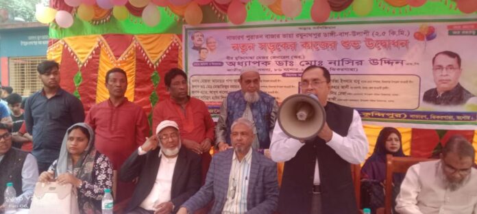 বিল্লাল হুসাইন : যশোরের ঝিকরগাছা নাভারণ পুরাতন বাজার কুন্দিপুর ভায়া রঘুনাথপুর ডাঙ্গী-বাগ-উলাশী পর্যন্ত আড়াই কিলোমিটার নতুন সড়কের কাজের শুভ উদ্বোধন করেছেন ৮৬ যশোর-২ আসনের জাতীয় সংসদ সদস্য অধ্যাপক ডাঃ নাসির উদ্দিন।আজ ৬ই ফেব্রুয়ারি সোমবার বিকাল পাঁচ টার সময় নাভারণ ইউনিয়নের ৪ নং ওয়ার্ডবাসীর আয়োজনে এই সড়কের কাজের শুভ উদ্বোধন করা হয়। নতুন সড়কের কাজের শুভ উদ্বোধনী অনুষ্ঠানে এ সময় বিশেষ অতিথি হিসেবে উপস্থিত ছিলেন, ঝিকরগাছা উপজেলা আওয়ামীলীগের সহ-সভাপতি মোস্তফা আনোয়ার পাশা জামাল, ঝিকরগাছা উপজেলা আওয়ামীলীগের সাবেক সাংগঠনিক সম্পাদক মোস্তাফিজুর রহমান মুসা, সাবেক আইন বিষয়ক সম্পাদক এ্যাড: আব্দুল কাদের, উপজেলা ভাইস চেয়ারম্যান সেলিম রেজা মহিলা ভাইস চেয়ারম্যান লুবনা তাক্ষী ও ৪ নং ওয়ার্ডের বর্তমান ইউপি সদস্য মজিবর রহমান সহ স্থানীয় বিভিন্ন পর্যায়ের নেতাকর্মী ও গণ্যমান্য ব্যক্তিবর্গ উপস্থিত ছিলেন।