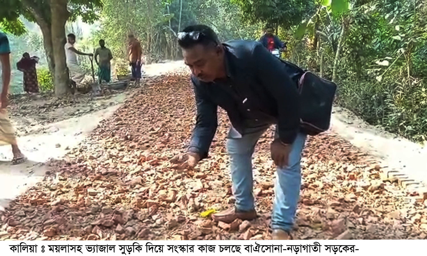 জানা যায়, সরকারের কালিয়া এলজিইডি অফিসের তত্ত্বাবধানে নড়াগাতী-বাঐসোনা ২ কিলোমিটার সড়ক সংস্কারের কাজ হাতিয়ে নিয়ে খুলনার ঠিকাদারি প্রতিষ্ঠান মেসার্স তালুকদার এন্টারপ্রাইজের লাইসেন্স ব্যবহারকারী মাদারীপুরের ঠিকাদার মহিউদ্দিন তালুকদার ওই রাস্তার সংস্কারের কাজ শুরু করেন।