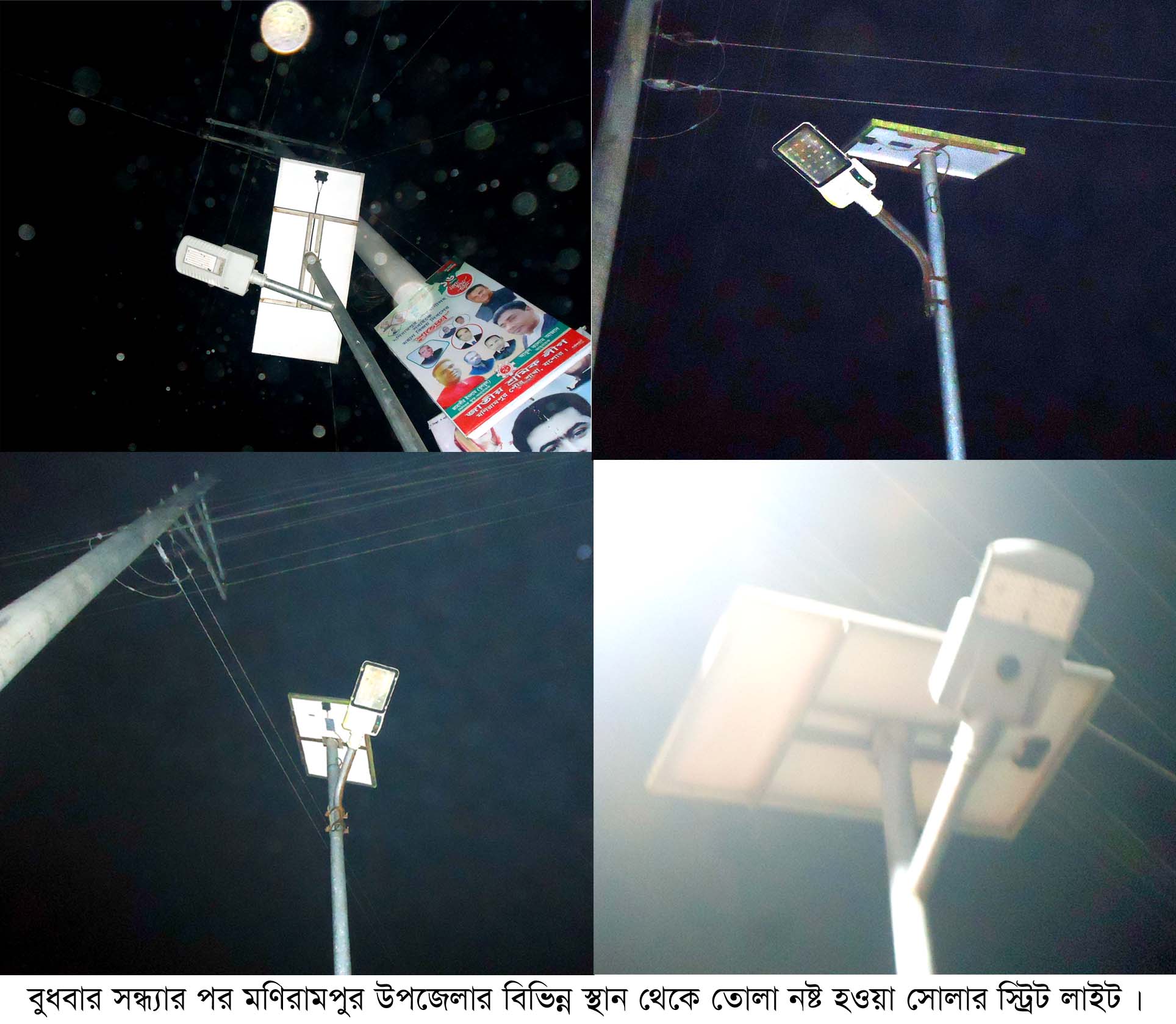 সূত্রে জানাযায়, মণিরামপুর উপজেলায় ১৭টি ইউনিয়ন ও ১টি পৌরসভায় কতগুলো সোলার স্ট্রিট লাইট আছে সে তথ্য উপজেলা প্রকল্প বাস্তবায়ন কর্মকর্তা কাছ থেকেও জানা সম্ভব হয়নি। সাধারণ মানুষের ধারণা বিভিন্ন স্থানে আনুমানিক ১১ থেকে ১২শ’ সোলার স্ট্রিট লাইট আছে। বিভিন্ন স্থানে সোলার স্ট্রিট লাইটগুলো লাগানোর সময় লোকজন দেখা গেছে। বর্তমান উপজেলায় ৬ থেকে ৭শ’টি সোলার স্ট্রিট লাইট নষ্ট হয়ে পড়ে আছে দেখার কেউ নেই। সরকার কোটি কোটি টাকা ব্যয় করে সোলার স্ট্রিট লাইটগুলো গুরুত পূর্নস্থানে স্থাপন করেছে। পৌর শহরে বিভিন্ন স্থানে সোলার স্ট্রিট লাইট দেওয়া হয়েছে বাংলাদেশ জল বায়ু পরিবর্তন ট্রাষ্ট পরিবেশ, বন ও জলবায়ু মন্ত্রনলায় অর্থয়ানে। এপ্রকল্পের সোলার লাইটগুলো উন্নত মানের হওয়ায় কত টাকা ব্যয় দেখানো হয়েছে তা জানাযায়নি। আর ইউনিয়ন গুলোতে সোলার স্ট্রিট লাইট দেওয়া হয়েছে দুর্যোগ ব্যবস্থাপনা ও ত্রাণ মন্ত্রনায় টিআর/কাবিটা প্রকল্পর মাধ্যমে। নাম প্রকাশে অনুচ্ছুক সরকারী এক প্রকল্প বাস্তবায়ন কর্মকর্তা বলেন, ২০১৭-২০১৮ অর্থ বছর থেকে শুরু হওয়া এই ধারাবাহিক প্রকল্প হঠাৎ বন্ধ হয়ে যায় ২০১৯-২০২০ অর্থ বছরে। ২০১৭-১৮ অর্থ বছরে কাবিটার প্রকল্পের ১ কোটি ১৮ লাখ ৭৯ হাজার ৫৬০ টাকা ব্যয়ে ১৪৯ টি স্ট্রিট লাইট স্থাপন করা হয়। প্রতিটা লাইটে ব্যয় দেখানো হয়েছে ৭৯ হাজার ৫৫০ টাকা ৬২ পয়সা। ২০১৮-২০১৯ অর্থ বছরে টিআর প্রকল্পের ১ কোটি ৫৪ লাখ ২৮ হাজার টাকা ব্যয়ে ২০০ টি সোলার স্ট্রিট লাইটে প্রতিটি লাইটে ব্যয় দেখানো হয়েছে ৭৭ হাজার ১৪০ টাকা। উপজেলায় ধারাবাহিক ভাবে আনুমানিক ১১ থেকে ১২শ’ সোলার স্ট্রিট লাইট বসানো হয়েছে। বুধবার সন্ধার পর সরেজমিন গিয়ে দেখাযায়, পৌর শহরে পশু হাসপাতালের সামনে একটি সোলার লাইট বন্ধ হয়ে আছে। যার পুল নাম্বার ৬৫, ধান বাজার মোড়ে একটি, সরকারী কলেজ মোড়ে একটি, গাংড়া মোড়ে একটি, আকরাম মোড়ে একটি, চালকিডাঙ্গা বাজার দেলোয়াবাড়ি মোড়ে একটি, চালকিডাঙ্গা দাস পাড়া মোড়ে একটি, বেগারিয়াতলা মজিদের সামনে একটি, ব্রহ্মনডাঙ্গা মোড়ে একটি, ব্রহ্মপুর মোড়ে একটি, বারপাড়া মাদ্রসা সামনে একটি, গাবুয়াখালি বাজারে একটি, ঢাকুরিয়া রথখোলা মোড়ে একটি এভাবে গ্রামের ৬ থেকে ৭শ’টি সোলার স্ট্রিট লাইট গুলো নষ্ট হয়ে আছে। জননেত্রী শেখ হাসিনা বলে ছিলেন দেশের প্রতিটি গ্রাম হবে শহর। সে চিন্তায় জনগনের জন্য গ্রামের রাস্তা গুলো পিচ, হেরিন বোন, ফিলাট সোলিং করে দিয়েছে, ছোট কালভাট, বড় ব্রিজ নির্মাণ করে চলেছে, প্রতিটি বাড়িতে শত ভাগ বিদ্যুৎ সংযোগ দিয়েছে ও রাস্তার মোড়ে মোড়ে সোলার স্ট্রিট লাইট বসানো হয়েছে। সন্ধ্যার সাথে সাথে স্ট্রিট লাইট গুলো অন্ধকারকে দুরে সরিয়ে ঝিকিম