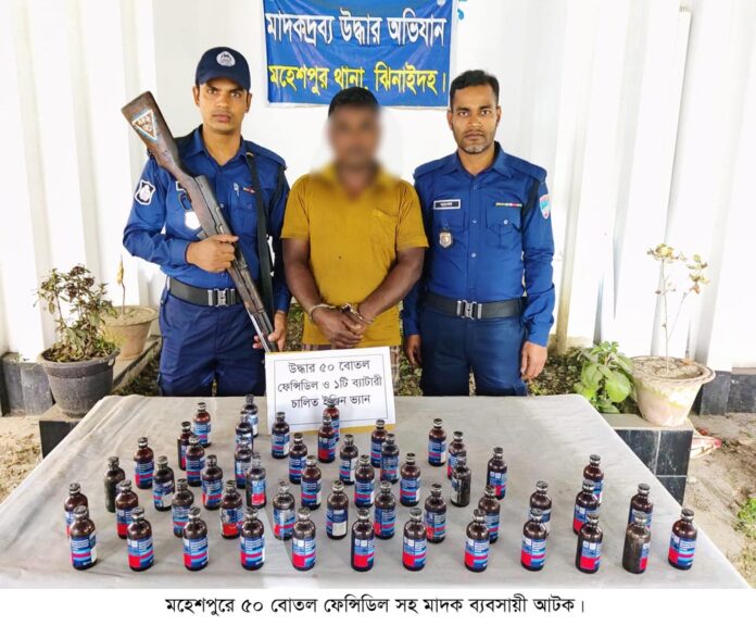 থানা সূত্রে প্রকাশ, মহেশপুর থানার এসআই মোফাজ্জেল হোসেন সঙ্গীয় ফোর্স নিয়ে অভিযান চালিয়ে ৫০ বোতল ফেন্সিডিলসহ মানিকদিহি গ্রামের মহব্বত আলীর ছেলে পারভেজ(২৫)কে ৫০ বোতল ফেন্সিডিলসহ আটক করে। এ সময় বোয়ালিয়া গ্রামের মৃত ইছাহক আলীর ছেলে মফিজুর(৪২)পালিয়ে যায়।