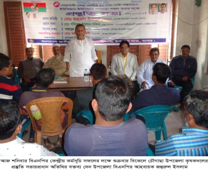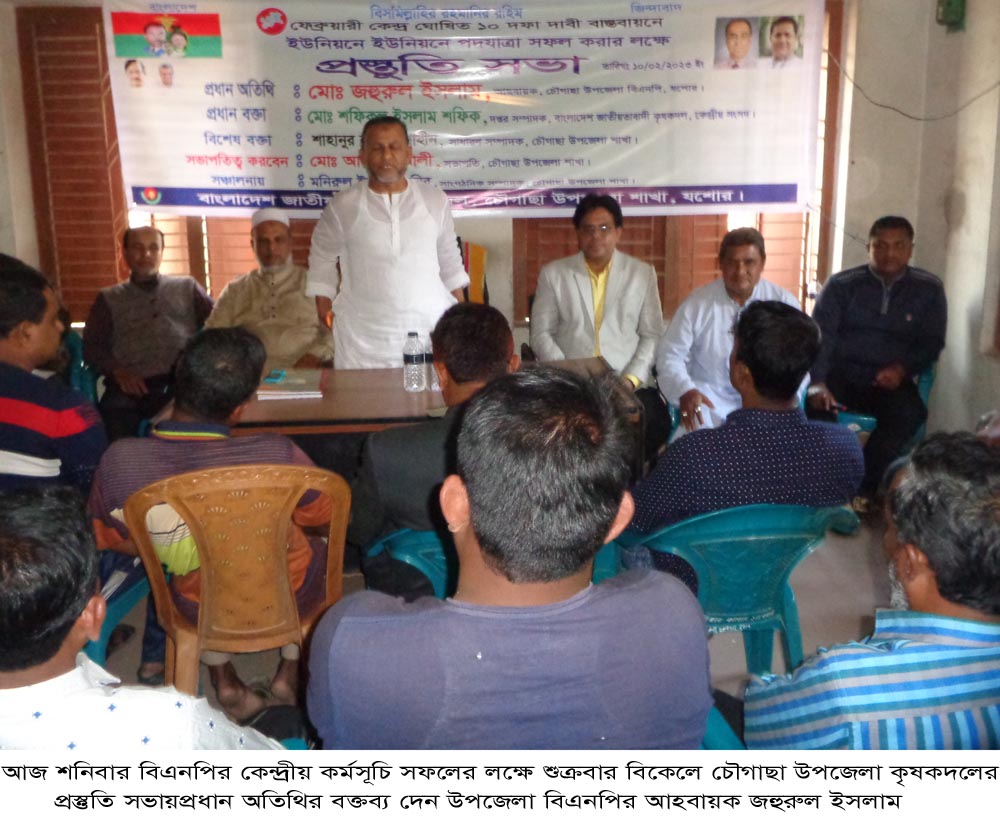 চৌগাছা (যশোর) প্রতিনিধি ॥ আজ শনিবার বিএনপির কেন্দ্র ঘোষিত কর্মসূচি ইউনিয়ন পর্যায়ে শান্তিপূর্ণ পদযাত্রা সফলের লক্ষে চৌগাছা উপজেলা কৃষকদলের প্রস্তুতি সভা অনুষ্ঠিত হয়েছে। শুক্রবার বিকেলে বিএনপির দলীয় কার্যালয়ে সভা অনুষ্ঠিত হয়। উপজেলা কৃষকদলের সভাপতি আজগার আলীর সভাপতিত্বে প্রধান অতিথির বক্তব্য দেন উপজেলা বিএনপির আহবায়ক জহুরুল ইসলাম।
