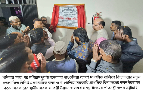 শনিবার (১১ ফেব্রুয়ারি-২০২৩) সন্ধ্যা সাড়ে ৭টার পর যশোরের মণিরামপুর উপজেলার গাংগুলিয়া আদর্শ মাধ্যমিক বালিকা বিদ্যালয়ের নতুন চার তলা ভিত বিশিষ্ট এক তলা একাডেমিক ভবন ও গাংগুলিয়া সরকারি প্রাথমিক বিদ্যালয়ের ভবন উদ্বোধন উপলক্ষ্যে ক্রীড়া ও সাংস্কৃতিক অনুষ্ঠানে প্রধান অতিথির বক্তব্যে এসব কথা বলেন প্রতিমন্ত্রী স্বপন ভট্টাচার্য্য। এ সময় তিনি ছাত্রছাত্রীদের উদ্দেশ্যে আরো বলেছেন- তোমরা আমার সন্তানের মতো, তোমরা ভালো লেখাপড়া করে ভালো ফলাফল অর্জন করতে পারলে তোমাদের নিজেদের এবং তোমাদের অভিভাবকরা যেমন খুশি হন, তেমনি আমরাও খুশি হই। আমরা গর্ব করে বলতে পারি আমাদের শিক্ষার্থীরা মনোযোগ দিয়ে পড়াশোনা করে। তোমাদের প্রতি আমার আহ্বান, তোমরা ভালো লেখাপড়া করে এখান থেকে পাস করবে এবং নিজেদের উন্নয়নের পাশাপাশি দেশের উন্নয়নেও ভূমিকা রাখবে। উদ্বোধন অনুষ্ঠান উপলক্ষে সাজানো হয় গোটা বিদ্যালয়।