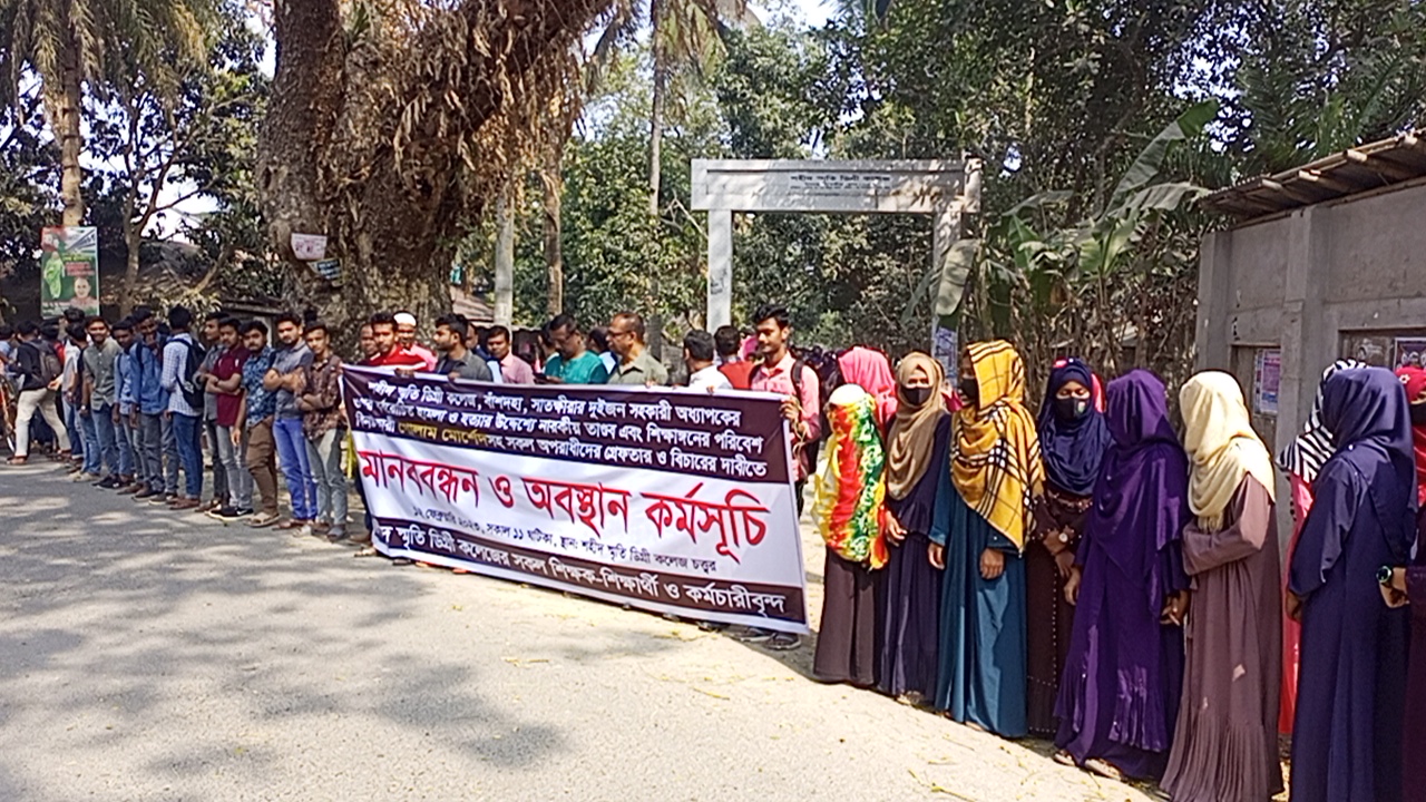 কলেজের তথ্য প্রযুক্তি বিভাগের সহকারী অধ্যাপক আবুল কালামের সভাপতিত্বে মানববন্ধনে বক্তব্য রাখেন, সহকারী অধ্যাপক অমিত চক্রবর্তী, সহকারী অধ্যাপক আমজাদ হোসেন, আছিফ বায়েজিত সাগর, দ্বিতীয় বর্ষের শিক্ষার্থী শামীমা হোসেন প্রমুখ।