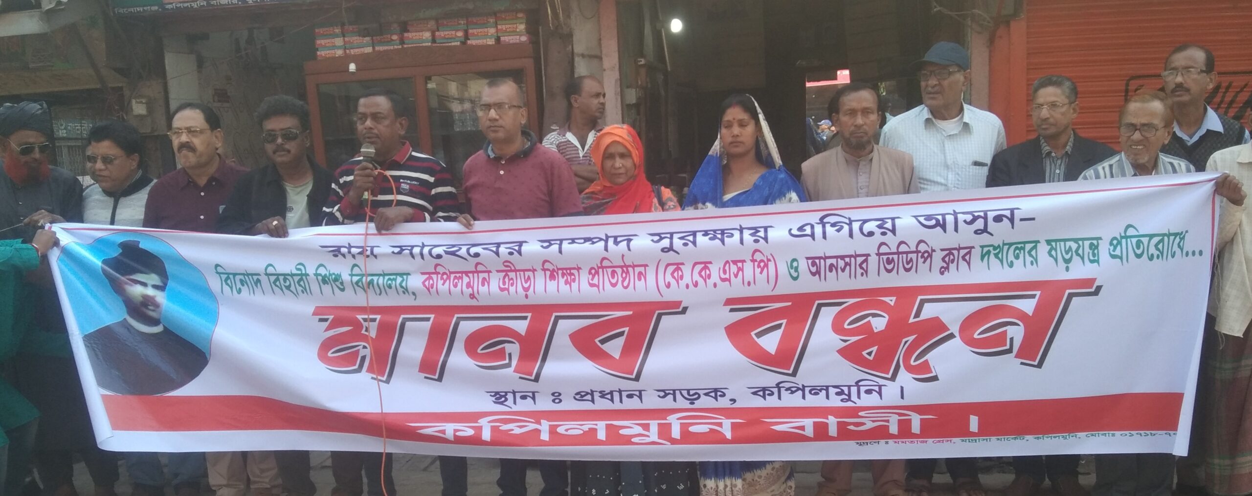 কপিলমুনি প্রতিনিধিঃ কপিলমুনি বিনোদ বিহারী শিশু বিদ্যালয়, কেকেএসপি ও আনসার ভিডিপি ক্লাবের ভূমিদখল ষড়যন্ত্রের প্রতিরোধে মানববন্ধন অনুষ্ঠিত হয়েছে। বুধবার সকাল ১০ টায় কপিলমুনি বাসীর ব্যানারে পাইকগাছা খুলনার কপিলমুনিস্থ প্রধান সড়কে এ মানববন্ধন অনুষ্ঠিত হয়। কপিলমুনি ইউপি চেয়ারম্যান কওছার আলী জোয়ার্দ্দারের সভাপত্বিতে শেখ ইকবাল হোসেন খোকন ও মদুসূদন হালদারের সঞ্চালনায় অনুষ্ঠিত মানববন্ধনে বক্তব্যে রাখেন, কপিলমুনি বিনোদ বিহারী শিশু বিদ্যালয়ের অধ্যক্ষ মুজিবর রহমান, উপাধ্যক্ষ আফসার আলী, অধ্যাপক রেজাউল করিম খোকন, আনন্দ মোহন বিশ্বাস, উপাধ্যক্ষ ত্রিদিব কান্তি মন্ডল, এম বুলবুল আহমেদ, জগদীশ দে, সাধন চন্দ্র ভদ্র, শেখ আব্দুর রশীদ, সরদার মোজাফ্ফর হোসেন, প্রধান শিক্ষক সঞ্জয় মন্ডল, মাদ্রাসা শিক্ষক আবুল কাশেম সিরাজী, শিক্ষক খলিলুর রহমান, হেদায়েত আলী টুকু, বিধান ভদ্র, কিনু পাল, মফিজুল বিশ্বাস, সন্দীপ সাধু, কামরুজ্জামান, মোসলেম উদ্দীন দয়াল, শান্তনু সাধু, শেখ আনারুল ইসলাম, সন্তোষ সরকার, শিক্ষক পলাশ দাশ, মেম্বর রবিন অধিকারী, আজিজুল বিশ্বাস, সখিনা বেগম ও খান মতলেব প্রমুখ।