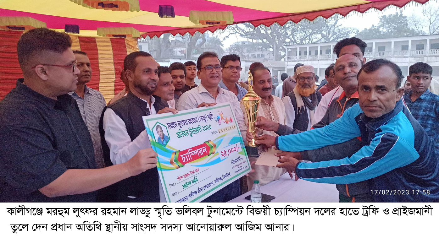 টুনামেন্ট পরিচালনা কমিটির আহব্বায়ক আশিকুর রহমান সোহাগের সভাপতিত্বে পুরস্কার বিতরনী অনুষ্টানে আরো উপস্থিত ছিলেন কালীগঞ্জ সহকারী কমিশনার (ভ’মি) হাবিবুল্লাহ হাবিব, মরহুম লাড্ডুর ছোট ভাই তবিবর রহমান মিনি, চ্যাম্পিয়ন দলের স্পন্সর ইউপি চেয়ারম্যান নাছির উদ্দিন চৌধুরী, রানাস আপ স্পন্সর ন্যাশনাল মেডিকেল ফার্ম্মেসির স্বর্তাধিকারী সুমন হোসেন, ম্যান অব দি ম্যাচ স্পন্সর মিজানুর রহমান ও কালীগঞ্জ ক্রীড়া ফেডারেশনের সহ-সভাপতি অজিত ভট্টাচাষ্য। অনুষ্টানটি সঞ্চালনা করেন কালীগঞ্জ উপজেলা ক্রীড়া সংস্থার সাধারন সম্পাদক জামির হোসেন।