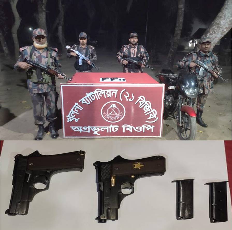 খুলনার ২১ বিজিবির অধিনায়ক লেফটেন্যান্ট কর্নেল মোহাম্মদ তানভীর রহমান,এক প্রেস বিজ্ঞপ্তি মাধ্যমে জানান, ২১ বিজিবি’র একটি দল গত রোববার রাতে বেনাপোল সীমান্তের অগ্রভূলাট এলাকায় দায়িত্ব থাকাকালে গোপন সংবাদের ভিত্তিতে অগ্রভূলাট দক্ষিনপাড়া এলাকা থেকে এক মোটরসাইকেল আরোহীকে (যশোর ল-১১-৮৮০৭) আসতে দেখে টহল দলের নিকটবর্তী আসলে তাকে থামতে বলে। মোটর সাইকেলটি থামানোর পর তাকে তল্লাশী করে তার কোমর থেকে ২টি ৯ এমএম পিস্তল (ইউএসএ), ২টি খালী ম্যাগাজিন এবং ১ টি মোটর সাইকেল উদ্ধার করা হয়। এক পর্যায়ে তল্লাশির সময় মোটরসাইকেল আরোহী তার পরনের লুঙ্গি ও পালসার মোটরসাইকেল ফেলে পালিয়ে যায়। পরে বিজিবি উদ্ধার হওয়া অস্ত্র, ম্যাগাজিন এবং মোটর সাইকেল আরোহীর বিরুদ্ধে আইনানুগ ব্যবস্থা গ্রহণের প্রয়োজনীয় ব্যবস্থা গ্রহণ করছেন বলে জানা গেছে।