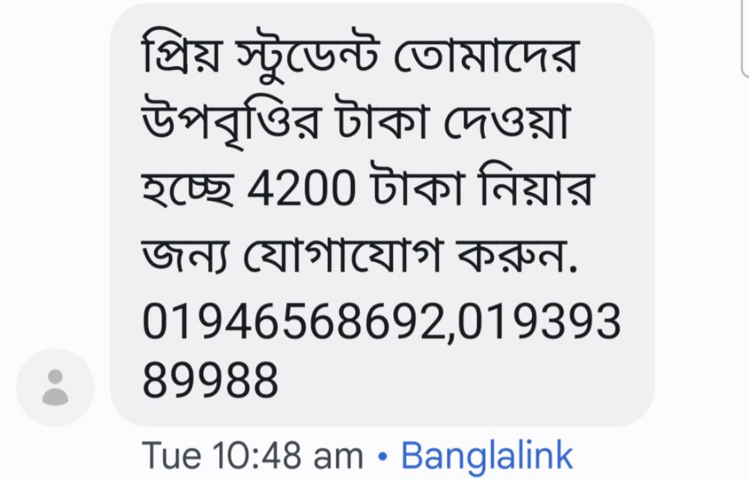 শিক্ষা অফিস জানিয়েছে- যে সব শিক্ষার্থীর ব্যাংক হিসাব নম্বর দেওয়া আছে, তাদের উপবৃত্তির টাকা সরাসরি ব্যাংকে জমা হয়। আর যাদের ব্যাংক হিসাব নেই তাদের টাকা মোবাইল ব্যাংকিং হিসাব নম্বরে পাঠানো হয়। সরাসরি মোবাইল নম্বর থেকে এভাবে কল বা এসএমএস পাঠিয়ে টাকা দেওয়া হয় না। আর আপাতত কোনো শ্রেণির উপবৃত্তির টাকা বিতরণ হচ্ছে না। এদিকে মোবারকপুর গ্রামের রিপন হোসেন জানান- তার মোবাইলেও এই বার্তা এসেছে। পরে সেই নম্বরে ফোন দিয়েছে। কিন্তু ফোনে কল হয়নি। যে কারণে তিনি কোনো ভাবে বার্তা প্রেরণকারিদের সাথে যোগাযোগ করতে পারেনি।