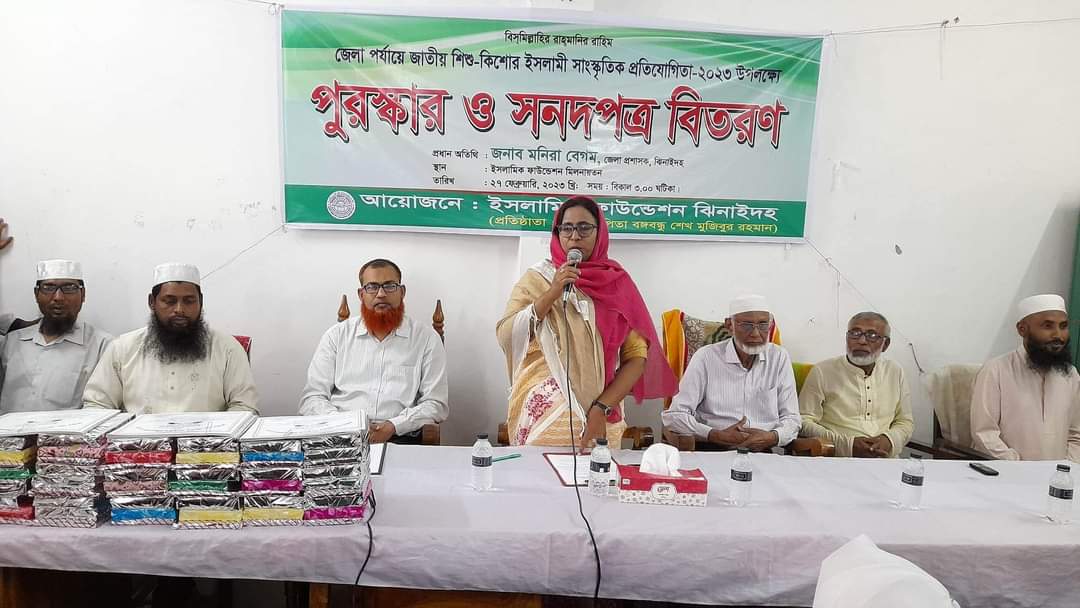 কামরুজ্জামান লিটন ঝিনাইদহ : ঝিনাইদহ ইসলামিক ফাউন্ডেশনের উদ্যোগে ইসলামী সাংস্কৃতিক প্রতিযোগিতা-২০২৩ অনুষ্ঠিত হয়েছে।সোমবার বিকালে নিজস্ব মিলনায়তনে ইসলামিক ফাউন্ডেশনের উপ-পরিচালক মোঃ আব্দুল হামিদ খানের সভাপতিত্বে প্রধান অতিথি হিসেবে উপস্থিত থেকে প্রতিযোগিতায় বিজয়ীদের মাঝে পুরস্কার বিতরণ করেন জেলা প্রশাসক মনিরা বেগম।এসময় তিনি বলেন, আজকের শিশুরাই আগামী দিনের ভবিষ্যৎ। জাতির পিতা বঙ্গবন্ধু শেখ মুজিবুর রহমান ইসলামিক ফাউন্ডেশন প্রতিষ্ঠা করেছেন। তোমরা অনেক সৌভাগ্যবান আজ জাতির পিতার প্রতিষ্ঠিত প্রতিষ্ঠানে এসে ইসলামী সাংস্কৃতিক প্রতিযোগিতায় অংশগ্রহণ করে বিজয়ী হয়েছো। তোমাদের জানা দরকার জাতির পিতা ইসলামের খেদমতে অনেক কাজ করেছেন। ইসলামিক ফাউন্ডেশন প্রতিষ্ঠাসহ মাদ্রাসা শিক্ষা বোর্ড,বিশ্ব ইজতেমার জন্য জায়গা প্রদান,বাংলাদেশ বেতার ও বাংলাদেশ টেলিভিশনে পবিত্র কুরআন তেলাওয়াত প্রচারসহ ইসলামের খেদমতে অনেক কাজ করেছেন। তোমারা পাঠ্য বইয়ের পাশাপাশি বিভিন্ন সাংস্কৃতিক প্রতিযোগিতায় অংশগ্রহণ করবে।এতে করে তোমাদের মেধার বিকাশ ঘটবে।জাতির পিতার লালিত স্বপ্ন তোমরাই পূর্ণ করবে।এসময় বিশেষ অতিথি হিসেবে উপস্থিত ছিলেন সরকারি নুরুন্নাহার মহিলা কলেজের সাবেক উপাধ্যক্ষ এন এম শাহ জালাল ও নারকেলবাড়িয়া কলেজের সাবেক অধ্যক্ষ মোঃ আমিনুর রহমান টুকু। অনুষ্ঠান শেষে জাতির পিতা বঙ্গবন্ধু শেখ মুজিবুর রহমানসহ পরিবারের সকল সদস্য এবং দেশের শান্তি ও কল্যাণ কামনা করে বিশেষ দোয়া ও মোনাজাত পরিচালনা করেন ইসলামিক ফাউন্ডেশনের মাষ্টার ট্রেইনার মাওলানা আবদুল্লাহ আল মামুন।উল্লেখ্য, ঝিনাইদহ জেলার ৬টি উপজেলার বিজয়ী প্রতিযোগীদের নিয়ে জেলা পর্যায়ে আজান,কিরাত, হামদ/নাত, উপস্থিত বক্তৃতা, কবিতা, রচনা ও ইসলামী জ্ঞানসহ ৭ টি বিষয়ে ২০ টি গ্ৰুপে ইসলামী সাংস্কৃতিক প্রতিযোগিতায় অংশ গ্রহণ করে।