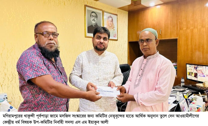যশোর : মণিরামপুরের মনোহরপুর ইউনিয়নের খাকুন্দী পূর্বপাড়া জামে মসজিদ সংস্কারের জন্য আর্থিক অনুদান প্রদান করা হয়েছে। বুধবার সিটি প্লাজা অফিস রুমে মসজিদ কমিটির নেতৃবৃন্দের হাতে আর্থিক অনুদান তুলে দেন আওয়ামীলীগের কেন্দ্রীয় ধর্ম বিষয়ক উপ-কমিটির নির্বাহী সদস্য এস এম ইয়াকুব আলী। এসময় উপস্থিত ছিলেন খাকুন্দী পূর্বপাড়া জামে মসজিদ কমিটির সাধারণ সম্পাদক গোলাম সরোয়ার ও খালেক মোড়ল।