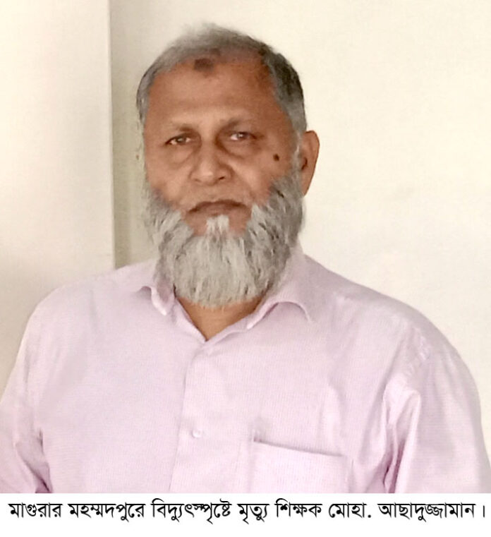 মুরাদ হোসেন, মহম্মদপুর (মাগুরা) থেকে : মাগুরার মহম্মদপুরে বিদ্যুৎস্পৃষ্ট হয়ে সিনিয়র শিক্ষক মোহা. আছাদুজ্জামানের মৃত্যু হয়েছে। বৃহস্পতিবার (৬ জুলাই) সকাল সাড়ে ৯ টার সময় নিজ বাড়ীতে বিদ্যুৎস্পৃষ্ট হয়ে তিনি মারা যান। আছাদুজ্জামান মহম্মদপুর বরকতিয়া এস এ আর দাখিল মাদ্রাসার সিনিয়র শিক্ষক এবং উপজেলা সদরের কানাইনগর গ্রামের মৃত্যু আব্দুর রহমান মস্টারের বড় ছেলে।পরিবার সুত্রে জনা যায়, বৃহস্পতিবার সকালে রাইস কোকারের মাধ্যমে রান্না করার সময় বোর্ডটি পুড়ে যায়। পরে বিদ্যুতের মেইন সুইস বন্ধ করে পুড়ে যাওয়া বোর্ডে হাত দিলে বিদ্যুৎস্পৃষ্ট হন। চিৎকার শুনে বড় ছেলে হামিম ছুটে এসে বাবাকে উদ্ধার করে উপজেলা স্বাস্থ্য কমপ্লেক্সে নিয়ে গেলে দায়িত্বরত চিকিৎসক মৃত্যু ঘোষণা করেন।আছাদুজ্জামানের বয়স হয়েছিল ৫৯ বছর। মৃত্যুকালে তিনি দুই ছেলে এক মেয়ে ও স্ত্রীসহ অনেক গুনগ্রাহি রেখে গেছেন। সহকর্মীর মৃত্যুতে মাদ্রাসা পরিচালনা পর্যেদর সভাপতি আশিকুর রহমান পাভেল, সুপার মোঃ ওহিদুজ্জামান, সহ-সুপার মোশারেফ হোসেন, প্রাক্তন সভাপতি জিয়াউল হক বাচ্চু এবং মাদ্রাসা পরিবারসহ উপজেলা শিক্ষক সমাজ গভীর শোক প্রকাশ করেছেন।