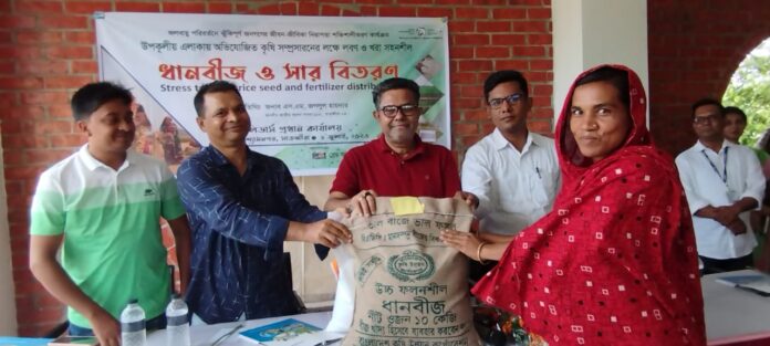 ০৬ জুলাই (বৃহস্পতিবার) সকাল ১১ টায় বেসরকারি উন্নয়ন সংস্থা লিডার্স এর বাস্তবায়নে এবং জার্মান দাতা সংস্থা ‘ব্রেড ফর দ্য ওয়ার্ল্ড’ এর আর্থিক সহযোগিতায় “জলবায়ু পরিবর্তনে ঝুঁকিপূর্ণ জনগণের জীবন-জীবিকা নিরাপত্তা শক্তিশালীকরণ কার্যক্রম” উপকূলীয় এলাকায় অভিযোজিত কৃষি সম্প্রসারনের লক্ষে লিডার্স এর প্রধান কার্যালয়ে ১১৪৮ জন কৃষকের মাঝে লবণ ও খরা সহনশীল ১১৪৮০ কেজি ধানবীজ ও ৯১৮৪ কেজি সার বিতরণ করা হয়েছে।উক্ত বীজ ও সার বিতরণ অনুষ্ঠানে প্রধান অতিথি হিসাবে উপস্থিত থেকে বীজ ও সার বিতরণ উদ্বোধন করেন সাতক্ষীরা ৪ আসনের মাননীয় সংসদ সদস্য জনাব এস.এম. জগলুল হায়দার। লিডার্স এর নির্বাহী পরিচালক মোহন কুমার মন্ডলের সভাপতিত্বে এসময় বিশেষ অতিথির বক্তব্য রাখেন উপজেলা কৃষি অফিসার জনাব মো: নাজমুল হুদা ও শ্যামনগর উপজেলা অনলাইন নিউজ ক্লাবের সভাপতি মারুফ হোসেন মিলন। এছাড়া আরও উপস্থিত ছিলেন সাংবাদিক মোহাম্মদ আলী, লিডার্স এর কর্মকর্তাগন, উপকূলীয় এলাকা মুন্সিগঞ্জ ও ঈশ^রীপুর ইউনিয়নের কৃষকগন। অনুষ্ঠানটি সঞ্চালনা করেন লিডার্স এর প্রকল্প কর্মকর্তা তাহসিনা সিরাজ।উক্ত অনুষ্ঠানে প্রধান অতিথি বলেন,“লিডার্স প্রতিবছর কৃষকদের বিভিন্ন প্রযুক্তি, বীজ, সার এবং কারিগরি সহযোগিতা করে আসছে। এরই ধারাবাহিকতায় এ বছরও লিডার্স উপকূলীয় কৃষকদের সহযোগিতা করছে। কৃষকদের পাশে থাকার জন্য লিডার্স এর প্রতি কৃতজ্ঞতা প্রকাশ করছি”। তিনি কৃষকদের এই বীজের মাধ্যমে উৎপাদন বাড়াতে আহ্বান জানান।তিনি সাম্প্রতি সংযুক্ত আরব আমিরাত হতে জায়েদ সাস্টেইন্যাবিলিটি প্রাইজ- ২০২৩ অর্জন করায় লিডার্সের পরিচালক মোহন কুমার মন্ডল ও লিডার্স পরিবারের সকলকে বিশেষভাবে অভিনন্দন জানান।উল্লেখ্য জলবায়ু পরিবর্তনের কারনে দুর্যোগ আগের চেয়ে অনেক বেড়েছে। দুর্যোগের ক্ষয়-ক্ষতি কাটিয়ে উঠতে এবং দুর্যোগ সহনশীল কৃষি উৎপাদন বৃদ্ধিতে এবং কৃষকদের আমন মৌসুমে লবণ ও খরা সহনশীল ধান চাষে উদ্বুদ্ধকরণের লক্ষ্যে শ্যামনগর ও কয়রার ৫টি ইউনিয়নে ১১৪৮ উপকারভোগী প্রত্যেক কৃষকের মাঝে ১০ কেজি লবণ সহনশীল ধান বীজ (ব্রি-৫২, ব্রি-৭৮, ব্রি-৬৭, ব্রি-৮৭, বিনা-১০, বি-আর ২৩) ও ৮ কেজি ইউরিয়া সার বিতরণ করা হয়েছে।