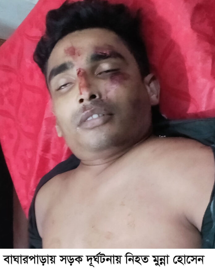 প্রত্যক্ষদর্শীরা জানান, সন্ধ্যা সাড়ে ৬ টার দিকে মোটরসাইকেলযোগে চাড়াভিটা তেলপাম্প থেকে তেল নিয়ে বাঘারপাড়ায় ফিরছিলেন মুন্না। এ সময় বোলদেঘাটা সাখাওয়াত মেম্বরের বাড়ির সামনে পৌঁছালে মোড় ঘোরার সময় বিপরিত দিক থেকে একটি ট্রাক এসে মোটরসাইকেলে ধাক্কা দেয়। এসময় স্থানীয়রা দ্রুত বাঘারপাড়া উপজেলা স্বাস্থ্যকমপ্লেক্সে নিয়ে আসলে কর্তব্যরত চিকিৎসক তাকে মৃত ঘোষণা করেন।